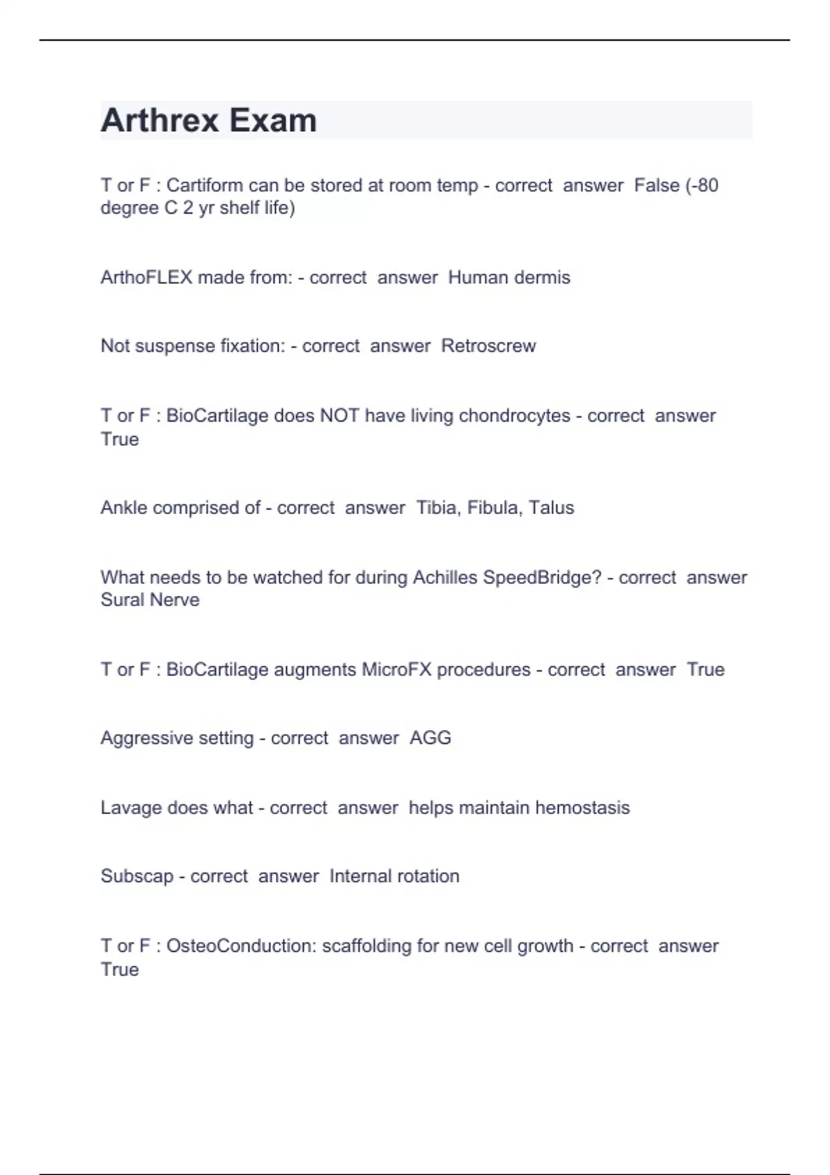Arthrex Exam Questions with complete solution 2024 Arthrex Exam T or F : Cartiform can be stored at room temp - correct answer False (-80 degree C 2 yr shelf life) ArthoFLEX made from: - correct answer Human dermis Not suspense fixation: - correct answer Retroscrew T or F : BioCartilage does NOT have living chondrocytes - correct answer True Ankle comprised of - correct answer Tibia, Fibula, Talus What needs to be watched for during Achilles SpeedBridge? - correct answer Sural Nerve T or F : BioCartilage augments MicroFX procedures - correct answer True Aggressive setting - correct answer AGG Lavage does what - correct answer helps maintain hemostasis Subscap - correct answer Internal rotation
