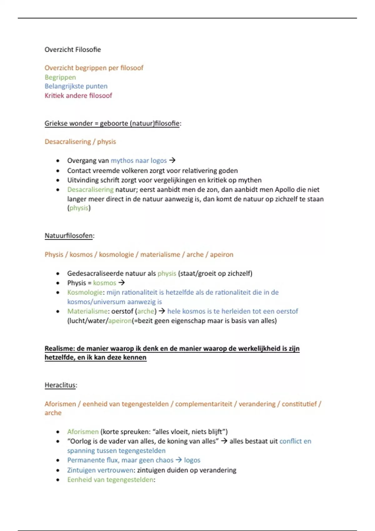 1e keer geslaagd met 17/20: Een gedetailleerde samenvatting van alle cruciale begrippen en theorieën rondom de filosofen: Heraclitus, Parmenides, Socrates, Plato, Aristoteles, Descartes, Locke, Hume, Kant, Nietzsche, Husserl, Heidegger, Sartre, Derrida & Wittgenstein, in een overzichtelijke samenvatting. Gebaseerd op het boek Wijsbegeerte: een Historische Inleiding en de colleges van G. Claessens aan de KU Leuven voor de opleiding Toegepaste Taalkunde