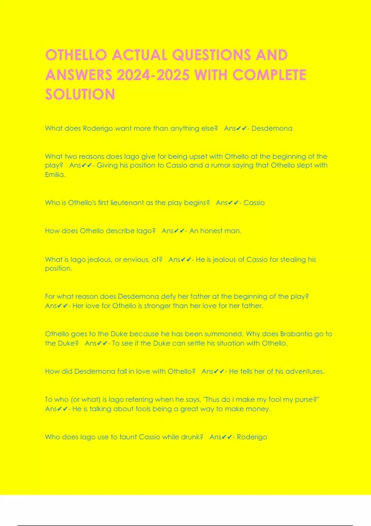 OTHELLO ACTUAL QUESTIONS AND ANSWERS WITH COMPLETE SOLUTION What does Roderigo want more than anything else? Ans- Desdemona What two reasons does Iago give for being upset with Othello at the beginning of the play? Ans- Giving his position to Cassio and a rumor saying that Othello slept with Emilia. Who is Othello's first lieutenant as the play begins? Ans- Cassio How does Othello describe Iago? Ans- An honest man. What is Iago jealous, or envious, of? Ans- He is jealous of Cassio for stealing his position. For what reason does Desdemona defy her father at the beginning of the play? Ans- Her love for Othello is stronger than her love for her father. Othello goes to the Duke because he has been summoned. Why does Brabantio go to the Duke? Ans- To see if the Duke can settle his situation with Othello. How did Desdemona fall in love with Othello? Ans- He tells her of his adventures. To who (or what) is Iago referring when he says, "Thus do I make my fool my purse?" Ans- He is talking about fools being a great way to make money. Who does Iago use to taunt Cassio while drunk? Ans- Roderigo What does Cassio fear after his fight with Roderigo? Ans- That Othello will find out he is drunk and was part of the fight. What is the result of Cassio's drunkenness? Ans- Cassio gets fired from his position as Lieutenant. Why does Roderigo do what Iago tells him to do? Ans- Because he is in love with Desdemona and will do whatever it takes to get her to fall for him. When Cassio is fired from his position in Othello's army, what does Iago tell him to do? Ans- To talk to Desdemona and seek her help to convince Othello to give him his job back. When Cassio brings musicians to play for Othello in 3.1, what does Othello think of them? Ans- He likes the music but asks that they stop playing. In what two places does this play take place? Ans- Venice and Cyprus. What does it mean for a man to be made a "cuckold?" Ans- To be cheated on. How does Iago plant the seed of jealousy in Othello's mind? Ans- He acts like he himself has a little suspicion that Desdemona is having an affair with Cassio. Maybe also something to do with the handkerchief. Who says, "Jealousy is the green-eyed monster," and what does that mean? Ans- Iago. It means that jealousy can consume and devour your life. What is so special about the handkerchief Desdemona drops? Ans- It was a gift from Othello that he received from an Egyptian woman.