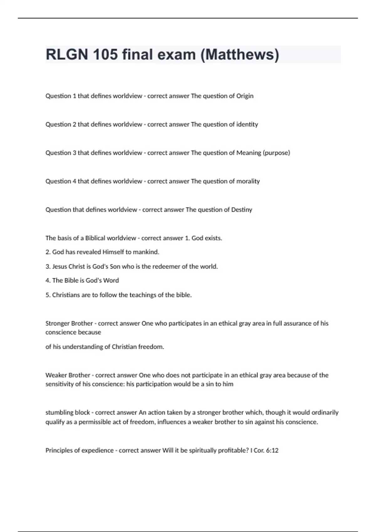 RLGN 105 final exam (Matthews) Question and answers 2024 verified to passRLGN 105 final exam (Matthews) Question 1 that defines worldview - correct answer The question of Origin Question 2 that defines worldview - correct answer The question of identity Question 3 that defines worldview - correct answer The question of Meaning (purpose) Question 4 that defines worldview - correct answer The question of morality Question that defines worldview - correct answer The question of Destiny The basis of a Biblical worldview - correct answer 1. God exists. 2. God has revealed Himself to mankind. 3. Jesus Christ is God's Son who is the redeemer of the world. 4. The Bible is God's Word 5. Christians are to follow the teachings of the bible. Stronger Brother - correct answer One who participates in an ethical gray area in full assurance of his conscience because