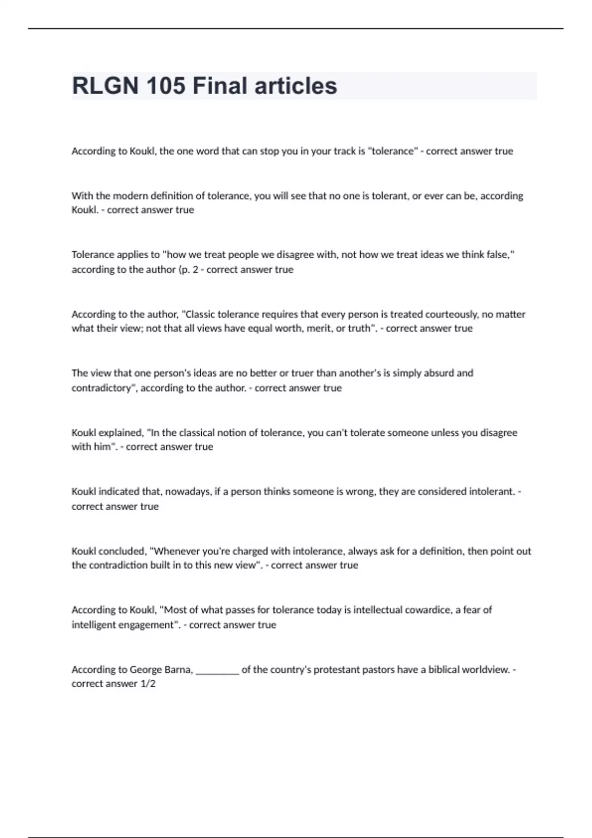 RLGN 105 Final articles Question and answers correctly solved 2024 RLGN 105 Final articles According to Koukl, the one word that can stop you in your track is "tolerance" - correct answer true With the modern definition of tolerance, you will see that no one is tolerant, or ever can be, according Koukl. - correct answer true Tolerance applies to "how we treat people we disagree with, not how we treat ideas we think false," according to the author (p. 2 - correct answer true According to the author, "Classic tolerance requires that every person is treated courteously, no matter what their view; not that all views have equal worth, merit, or truth". - correct answer true The view that one person's ideas are no better or truer than another's is simply absurd and contradictory", according to the author. - correct answer true Koukl explained, "In the classical notion of tolerance, you can't tolerate someone unless you disagree with him". - correct answer true Koukl indicated that, nowadays, if a person thinks someone is wrong, they are considered intolerant. - correct answer true