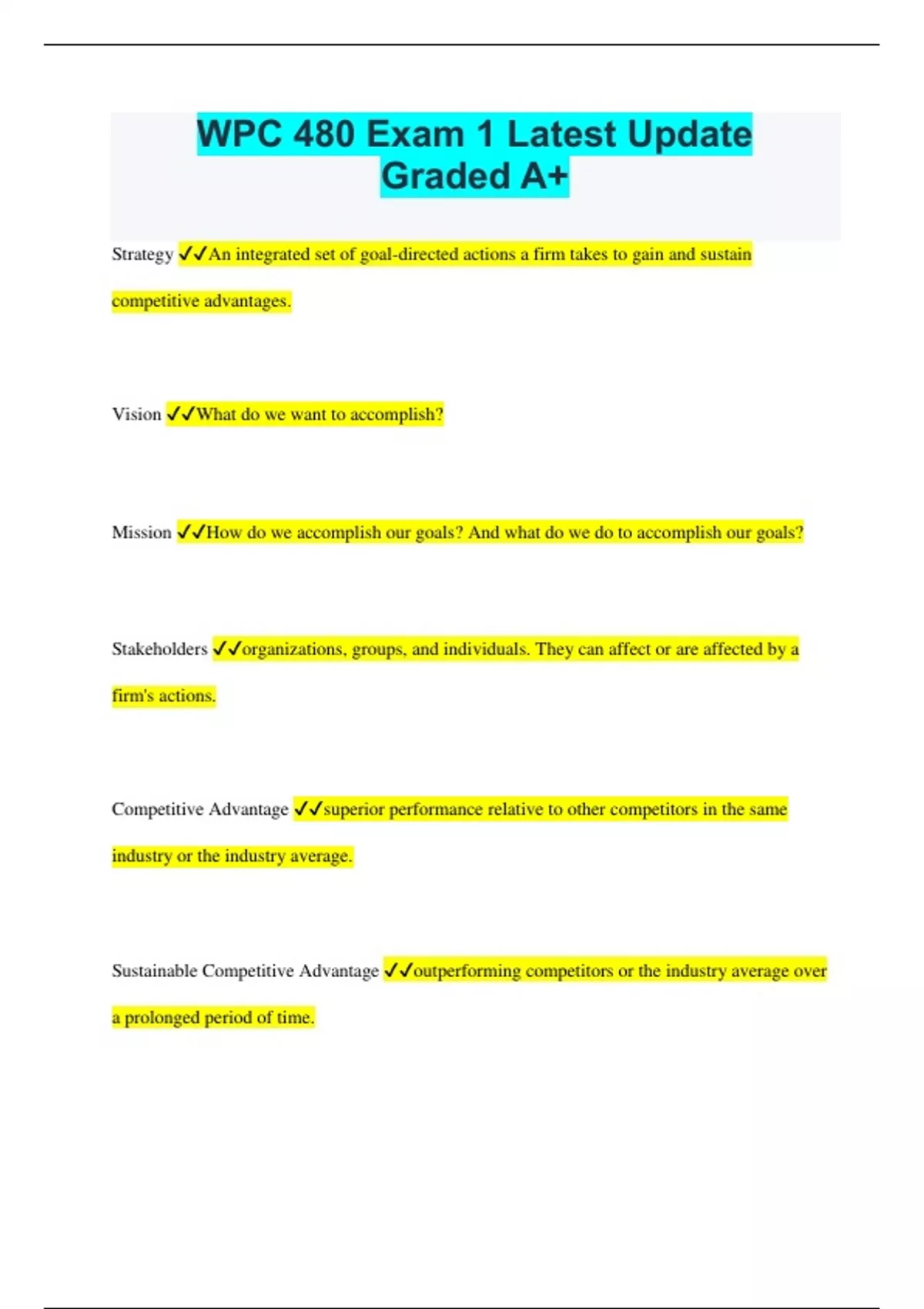 WPC 480 Exam 1 Latest Update Graded A+ Strategy An integrated set of goal-directed actions a firm takes to gain and sustain competitive advantages. Vision What do we want to accomplish? Mission How do we accomplish our goals? And what do we do to accomplish our goals? Stakeholders organizations, groups, and individuals. They can affect or are affected by a firm's actions. Competitive Advantage superior performance relative to other competitors in the same industry or the industry average. Sustainable Competitive Advantage outperforming competitors or the industry average over a prolonged period of time. Competitive Parity performance of two or more firms at the same level Strategic Management Process -Environmental scanning -Strategy formulation -Strategy implementation -Strategy evaluation Intended strategy the outcome of a rational and structured top-down strategic plan Emergent strategy any unplanned strategic initiative, bubbles up from the bottom of the organization and can influence and shape a firm's overall strategy. Realized strategy combination of intended and emergent strategy PESTEL Framework Political factors: processes and actions of government bodies. Lobbying, public relations, contributions, litigations. Economic factors: macro economic climates. Growth rates, employment, interest rates, price stability, currency exchange rates. Sociocultural factors:demographic trends,cultures, norms, and values. Technological factors: innovations in process and product technology Ecological factors:involve environmental issues (e.g., Natural environment, global warming, sustainable economic growth). Legal factors:official outcomes of political processes (e.g., (de)regulations, court decisions, laws) Competitive Industry Structure -Perfect competition -Oligopoly -Monopolistic competition -Monopoly Strategic Groups companies in a specific industry that pursue similar strategies.