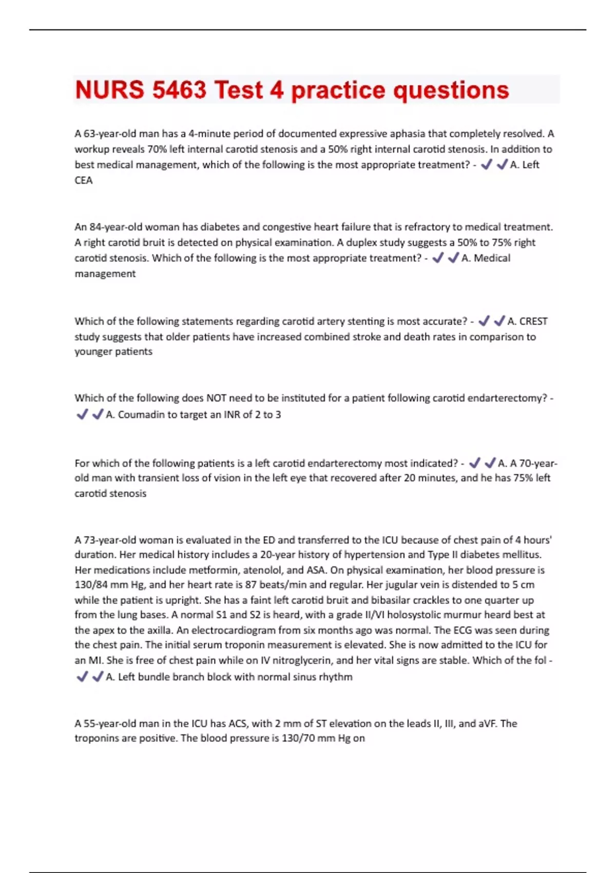 A 63-year-old man has a 4-minute period of documented expressive aphasia that completely resolved. A workup reveals 70% left internal carotid stenosis and a 50% right internal carotid stenosis. In addition to best medical management, which of the following is the most appropriate treatment? - A. Left CEA An 84-year-old woman has diabetes and congestive heart failure that is refractory to medical treatment. A right carotid bruit is detected on physical examination. A duplex study suggests a 50% to 75% right carotid stenosis. Which of the following is the most appropriate treatment? - A. Medical management Which of the following statements regarding carotid artery stenting is most accurate? - A. CREST study suggests that older patients have increased combined stroke and death rates in comparison to younger patients Which of the following does NOT need to be instituted for a patient following carotid endarterectomy? - A. Coumadin to target an INR of 2 to 3 For which of the following patients is a left carotid endarterectomy most indicated? - A. A 70-yearold man with transient loss of vision in the left eye that recovered after 20 minutes, and he has 75% left carotid stenosis A 73-year-old woman is evaluated in the ED and transferred to the ICU because of chest pain of 4 hours' duration. Her medical history includes a 20-year history of hypertension and Type II diabetes mellitus. Her medications include metformin, atenolol, and ASA. On physical examination, her blood pressure is 130/84 mm Hg, and her heart rate is 87 beats/min and regular. Her jugular vein is distended to 5 cm while the patient is upright. She has a faint left carotid bruit and bibasilar crackles to one quarter up from the lung bases. A normal S1 and S2 is heard, with a grade II/VI holosystolic murmur heard best at the apex to the axilla. An electrocardiogram from six months ago was normal. The ECG was seen during the chest pain. The initial serum troponin measurement is elevated. She is now admitted to the ICU for an MI. She is free of chest pain while on IV nitroglycerin, and her vital signs are stable. Which of the fol - A. Left bundle branch block with normal sinus rhythm A 55-year-old man in the ICU has ACS, with 2 mm of ST elevation on the leads II, III, and aVF. The troponins are positive. The blood pressure is 130/70 mm Hg ona nitroglycerin drip at 5 μg/kg/min keeping the patient chest pain free, but ECG changes persist and only 1 mm of ST elevation is seen. There is no lower extremity edema. The patient was given ASA upon entry into the ED. What is/are the next best steps in the management of this patient? - Anticoagulation, IV β-blocker, ACE inhibitor, nitroglycerin, and alert catheterization lab A 65-year-old man with history of diabetes presents to the Emergency Department stating he has had substernal chest pain and diaphoresis for 45 minutes. Which is the most important next step in management? - Aspirin to chew In the initial evaluation of a patient with chest pain, which is the most important diagnostic test? - ECG A 54-year-old man is seen at a rural ED with 1 hour of nausea and substernal chest pain radiating to his jaw. The ECG shows STEMI. PCI is not performed at this hospital and only performed at a hospital 2 1/2 hours away. Which of the following statements is most accurate? - C Administer thrombolytics, then transfer to PCI center. Which of the following is NOT an accurate description of hypothermia therapy for post-cardiac arrest patients? - B Therapeutic hypothermia has a proven effect in reducing the rate of recurrent ventricular fibrillation A 64-year-old man who was being treated in the hospital for acute cholecystitis is found to be unresponsive. He was noted to be in VF and underwent chest compressions for several minutes in addition to cardioversion. The patient has return of spontaneous rhythm and vital signs. Which of the following is an important treatment for this patient? - A Percutaneous coronary angiography Which of the following statements regarding out-of-hospital sudden cardiac arrest (SCA) is true? - E Therapeutic hypothermia improves neurological outcome after SCA in patients with depressed mental status after resuscitation. What type of MI is this II, III, AvF - C. InferiorA 59-year-old man complains of severe chest pain that radiates to his back. His brachial pulses appear unequal between his right and left arms. He appears hemodynamically stable. On chest radiography, he has a widened mediastinum. Which of the following is the best next step? - B Obtain CT of chest with intravenous contrast. A 45-year-old woman with new-onset aortic regurgitation is found to have aortic dissection of the ascending aorta and aortic arch by TEE. She is relatively asymptomatic. Which of the following is the best management? - C Surgical repair of the dissection A 61-year-old man is found on physical examination to have an asymptomatic AAA. Ultrasound evaluation reveals that the AAA measures 4 cm in diameter. Which of the following is the best surveillance strategy for his AAA? - D Ultrasound evaluation every year Which of the following is a known complication associated with AAA? - Painful discoloration of the great toe Which of the following statements is true regarding EVAR? - Most EVAR complications do not require open interventions For which of the following patients is nonoperative management most appropriate? - B A 96-yearold man with severe dementia and a 6-cm AAA. The patient has been a long-term resident of a chronic care facility due to inability to care for himself secondary to his dementia A 45-year-old man with a past medical history of diabetes, hyperlipidemia, and hypertension has smoked one pack of cigarettes a day for the past 15 years and drinks four glasses of wine every weekend. He is found to have an AAA incidentally on CT imaging of the abdomen. Which of the following is the most important predisposing factor for the development of his AAA? - B Smoking A 68-year-old man with