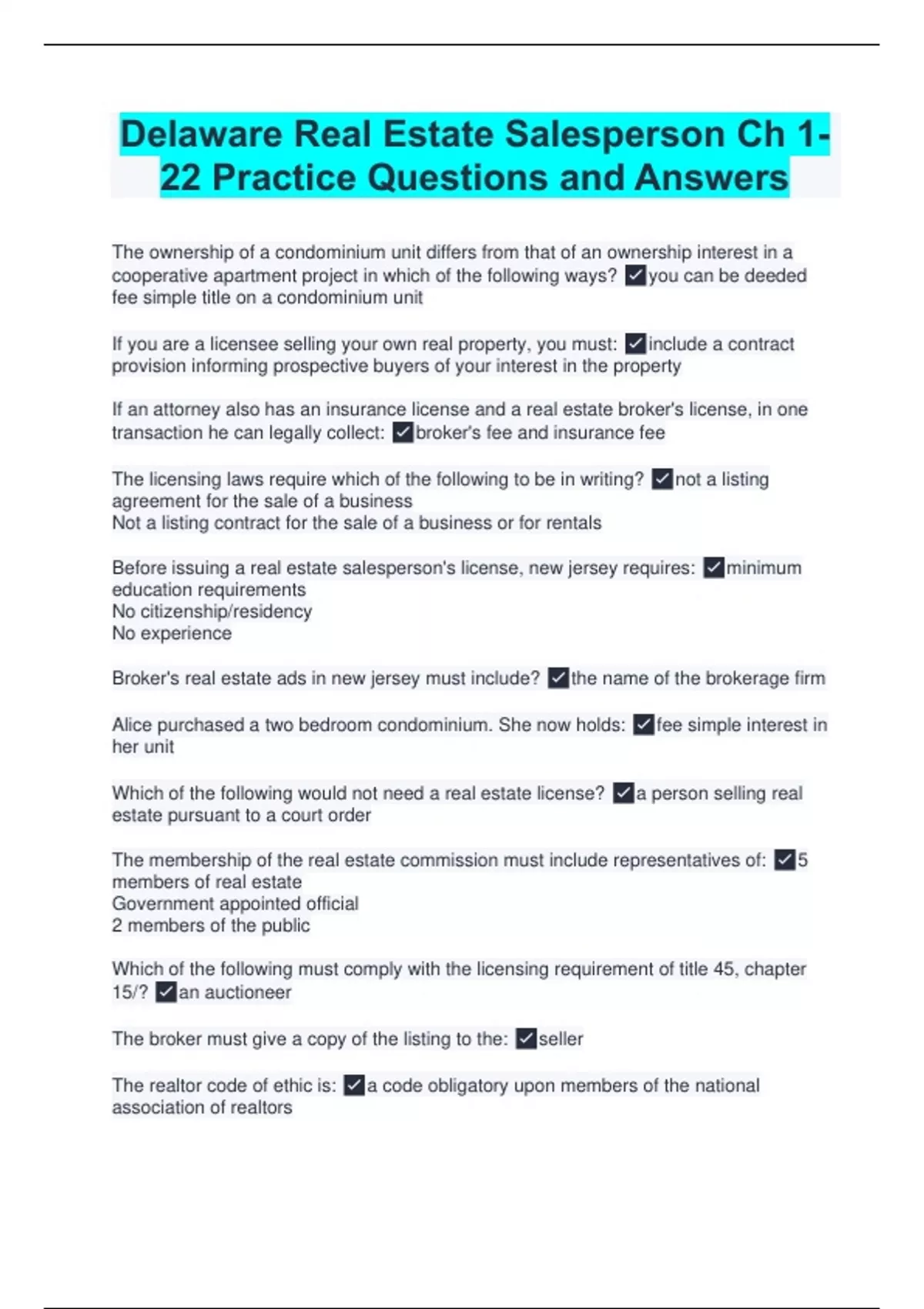 Delaware Real Estate Salesperson Ch 1-22 Practice Questions and Answers