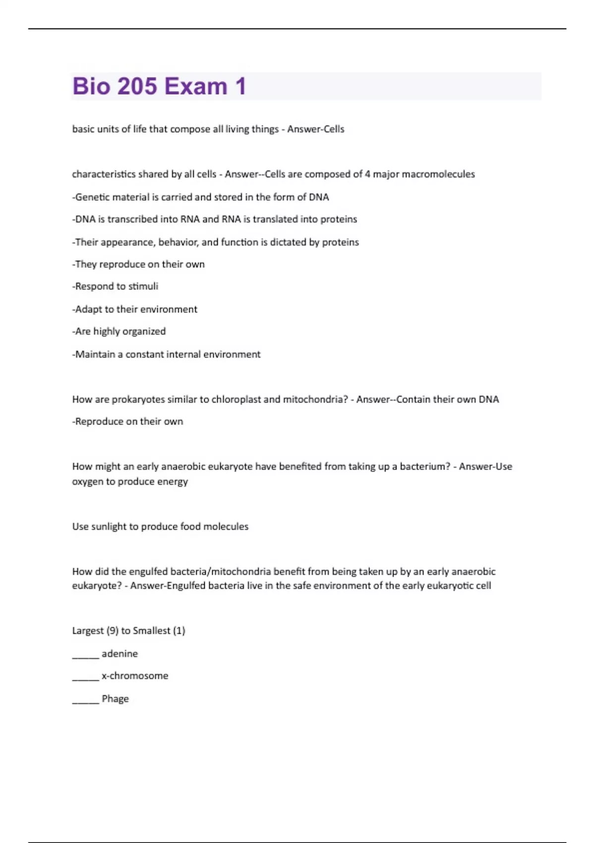 basic units of life that compose all living things - Answer-Cells characteristics shared by all cells - Answer--Cells are composed of 4 major macromolecules -Genetic material is carried and stored in the form of DNA -DNA is transcribed into RNA and RNA is translated into proteins -Their appearance, behavior, and function is dictated by proteins -They reproduce on their own -Respond to stimuli -Adapt to their environment -Are highly organized -Maintain a constant internal environment How are prokaryotes similar to chloroplast and mitochondria? - Answer--Contain their own DNA -Reproduce on their own How might an early anaerobic eukaryote have benefited from taking up a bacterium? - Answer-Use oxygen to produce energy Use sunlight to produce food molecules How did the engulfed bacteria/mitochondria benefit from being taken up by an early anaerobic eukaryote? - Answer-Engulfed bacteria live in the safe environment of the early eukaryotic cell Largest (9) to Smallest (1) _____ adenine _____ x-chromosome _____ Phage_____ tRNA _____ sperm _____ coffee bean _____ sesame seed _____ mitochondria _____ E.coli bacterium - Answer-9- coffee bean 8- sesame seed 7- sperm 6- X chromosome 5- mitochondria 4- E. coli 3- phage 2- tRNA 1- adenine Cell ___________ fits ____________. - Answer-structure, function Four methods to lysing cells - Answer--High frequency sound lyses cells -Mechanical force shears cells -Detergent lyses cells by puts holes in the plasma membrane -Cells forced through a small hole using high pressure break open What is the term used to describe the thick soup of cell extract produced when cell are broken open? - Answer-homogenate What is the technique that separates a homogenate into different parts? - Answer-centrifugation _____________________: repeated centrifugation at different speeds separates cell components based on size and density - Answer-Differential centrifugation___________: a matrix of small beads that separates proteins according to charge, size, hydrophobicity, or ability to bind to a specific molecule. - Answer-Chromatography What binds to column? What releases bound molecules from column? Ion Exchange chromatography - Answer--Molecules with a charge opposite of that of the beads in the column -Solvent that alters the pH of the column What binds to column? What releases bound molecules from column? Affinity chromatography - Answer--Proteins that interact with substrate molecule on the beads -Solvent that alters the pH of the column What binds to column? What releases bound molecules from column? Gel filtration chromatography - Answer--Small molecules that enter holes in the beads -Solvent that washed molecules ____________: identifies the presence of two or more fluorescent labels in the same place in a cell, tissue, or organelle - Answer-Co-localization______________: uses antibodies conjugated to a fluorophore that recognize a protein that is abundant in and localized to neurons! - Answer-expressing a transgene __________________: used to see if one protein interacts with another - Answer-BiFC What question does co-localization address? - Answer-Where in the cell is my protein located Note: two proteins can be in the same place and not interact. Co-localization does NOT test proteinprotein interactions. What question does BiFC address? - Answer-Does protein A interact with protein B ____________: widely employed analytical technique used to detect proteins in a sample of homogenate or cell extract. - Answer-Western blot 3 stages of a Western Blot - Answer-1) SDS-PAGE (SDS polyacrylamide-gel electrophoresis) 2) Transfer proteins onto a membrane (such as nitrocellulose) 3) Detection of proteins from the membrane using immunostaining _______ give amino acids their unique properties - Answer-Side chains Lysozyme -Where is it found? -What does it do? -How does it work? - Answer--Saliva, tears, human milk, mucus, other secretions -Catalyze hydrolysis of sugars in the bacterial cell wall.-Adds a water molecule to a single bond that joins two adjacent sugar groups in a polysaccharide chain causing the bond to break. Antibodies are globular proteins composed of 4 polypeptide chains, two of which are held together by a disulfide bond. What would be used to describe the structure of an antibody - Answer-quaternary structure Consider the description below and select the one that could be classified as a "protein domain." a) an α helix b) a complex of several polypeptide chains c) a substrate-binding pocket - Answer-C