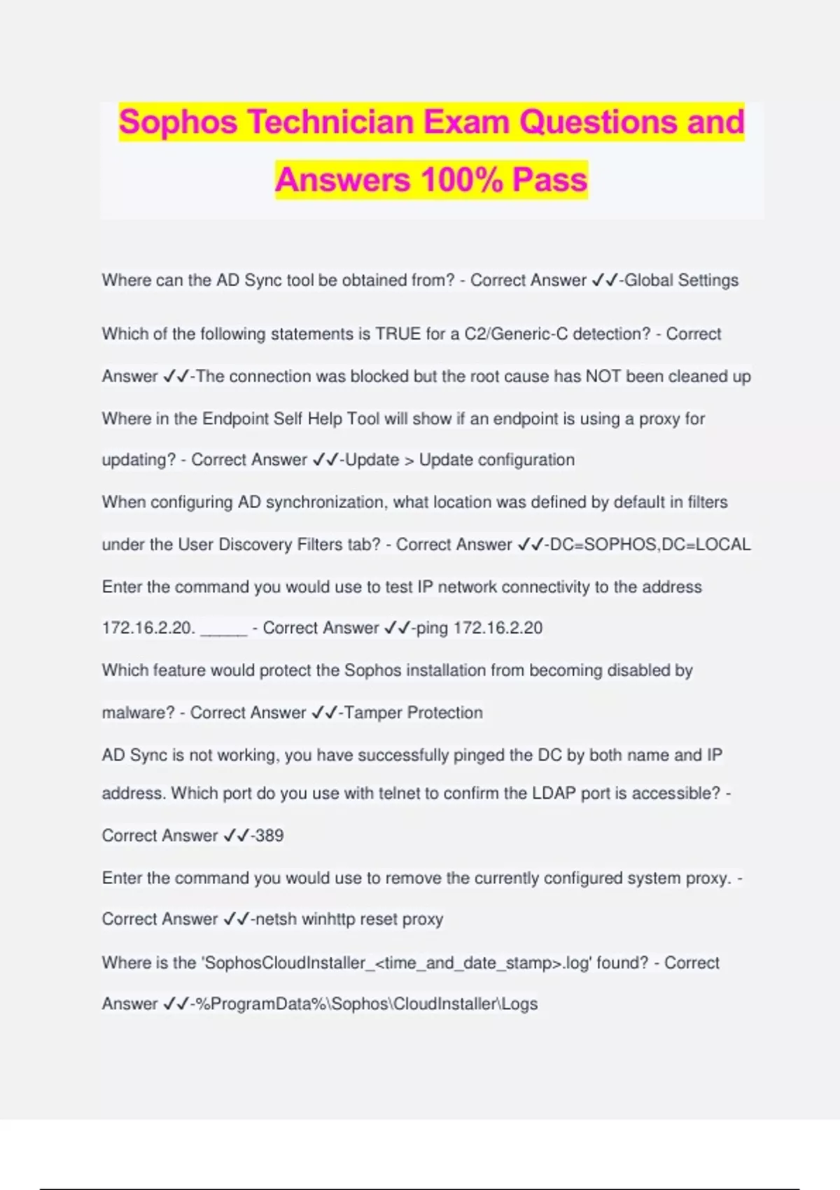 Sophos Technician Exam Questions and Answers 100% Pass Where can the AD Sync tool be obtained from? - Correct Answer ️️ -Global Settings Which of the following statements is TRUE for a C2/Generic-C detection? - Correct Answer ️️ -The connection was blocked but the root cause has NOT been cleaned up Where in the Endpoint Self Help Tool will show if an endpoint is using a proxy for updating? - Correct Answer ️️ -Update > Update configuration When configuring AD synchronization, what location was defined by default in filters under the User Discovery Filters tab? - Correct Answer ️️ -DC=SOPHOS,DC=LOCAL Enter the command you would use to test IP network connectivity to the address 172.16.2.20. _____ - Correct Answer ️️ -ping 172.16.2.20 Which feature would protect the Sophos installation from becoming disabled by malware? - Correct Answer ️️ -Tamper Protection AD Sync is not working, you have successfully pinged the DC by both name and IP address. Which port do you use with telnet to confirm the LDAP port is accessible? - Correct Answer ️️ -389 Enter the command you would use to remove the currently configured system proxy. - Correct Answer ️️ -netsh winhttp reset proxy Where is the 'SophosCloudInstaller_<time_and_date_stamp>.log' found? - Correct Answer ️️ -%ProgramData%SophosCloudInstallerLogs What is the function of application lockdown in Intercept X? - Correct Answer ️️ -To prevent malicious behavior in software Which of these cleanup tools will scan for root kits? - Correct Answer ️️ -Virus Removal tool What is the minimum type of user required to connect to AD to gather the user and group information? - Correct Answer ️️ -Domain user TRUE or FALSE: Sophos recommends disabling HTTPS inspection for Sophos updating traffic. - Correct Answer ️️ -True On a Windows computer, which component logs information to the 'S' file? - Correct Answer ️️ -Sophos Intercept X The Central Admin Dashboard shows that none of your endpoints are using one of your update caches. When pinging the update cache by name it fails. What command do you use to investigate this further? - Correct Answer ️️ -nslookup What is the third step of the troubleshooting process? - Correct Answer ️️ -Resolve and verify By default, computers get the latest Sophos product updates automatically, where can an admin change this to allow control over updates? - Correct Answer ️️ -Global settings > Controlled Updates In which 3 ways can you allow a quarantined file to be restored? - Correct Answer ️️ - SHA-256 The file paths The certificate When investigating an updating issue on one of your endpoints, you used the telnet command to connect to on port 443. This confirmed that there is a problem using a direct connection. What is most likely to b