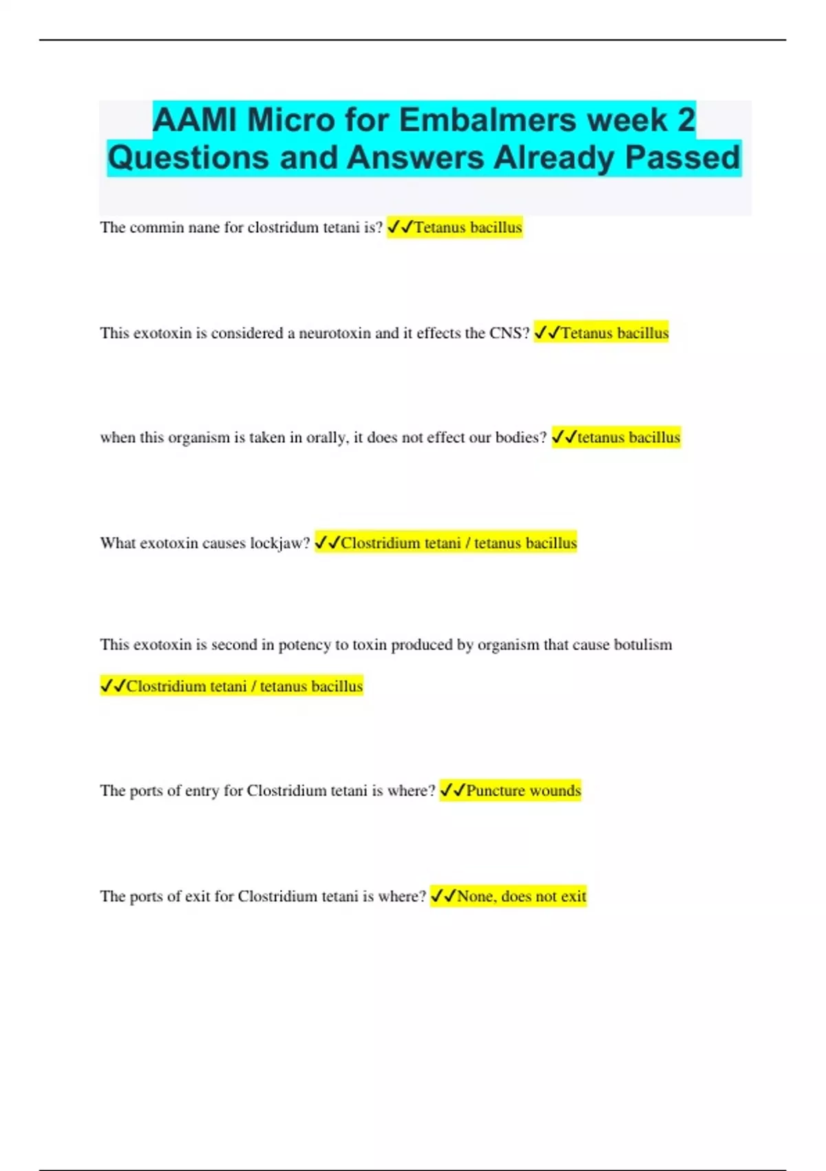 AAMI Micro for Embalmers week 2 Questions and Answers Already Passed The commin nane for clostridum tetani is? Tetanus bacillus This exotoxin is considered a neurotoxin and it effects the CNS? Tetanus bacillus when this organism is taken in orally, it does not effect our bodies? tetanus bacillus What exotoxin causes lockjaw? Clostridium tetani / tetanus bacillus This exotoxin is second in potency to toxin produced by organism that cause botulism Clostridium tetani / tetanus bacillus The ports of entry for Clostridium tetani is where? Puncture wounds The ports of exit for Clostridium tetani is where? None, does not exit What exits in the spore state in soil? Clostridium perfringens This is a highly fatal disease caused by the contamination of wounds with soil containing the spores of clostridium perfringens Gas gangrene What in the wound facilitate the germination of clostridial spores and their vegetative growth by reducing the oxygen in the wound? Aerobes The postmortem disease process caused by the exotoxins and enzymes of clostridium perfringens is called? Tissue gas Food intoxication caused by clostridium perfingens is ranked ? To staphylococcus aureus. Second Portal of entry for clostridium perfringens Wounds Portal and immunity for clostridium perfringens None This organism is a common resident of the soil Clostridium botulinum Botulism is a ______, not an infection (like tetanus) Poisoning Spores from clostridium botulinum get into what? Food This toxin is the most deadliest a poisons Clostridium botulinum This toxin is classified as an agent for chemical warfare Clostridium botulinum Clostridium botulinum is different from diphtheria and tetanus because it causes disease when _____, and is more resistant to heat. Swallowed The genus corynebacterium includes what (one)