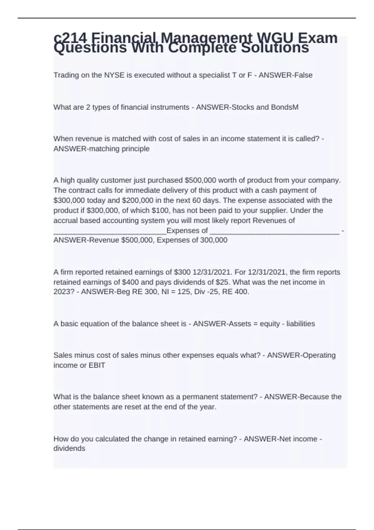 Trading on the NYSE is executed without a specialist T or F - ANSWER-False What are 2 types of financial instruments - ANSWER-Stocks and BondsM When revenue is matched with cost of sales in an income statement it is called? - ANSWER-matching principle A high quality customer just purchased $500,000 worth of product from your company. The contract calls for immediate delivery of this product with a cash payment of $300,000 today and $200,000 in the next 60 days. The expense associated with the product if $300,000, of which $100, has not been paid to your supplier. Under the accrual based accounting system you will most likely report Revenues of ___________________________Expenses of _______________________________ - ANSWER-Revenue $500,000, Expenses of 300,000 A firm reported retained earnings of $300 12/31/2021. For 12/31/2021, the firm reports retained earnings of $400 and pays dividends of $25. What was the net income in 2023? - ANSWER-Beg RE 300, NI = 125, Div -25, RE 400. A basic equation of the balance sheet is - ANSWER-Assets = equity - liabilities Sales minus cost of sales minus other expenses equals what? - ANSWER-Operating income or EBIT What is the balance sheet known as a permanent statement? - ANSWER-Because the other statements are reset at the end of the year. How do you calculated the change in retained earning? - ANSWER-Net income - dividends