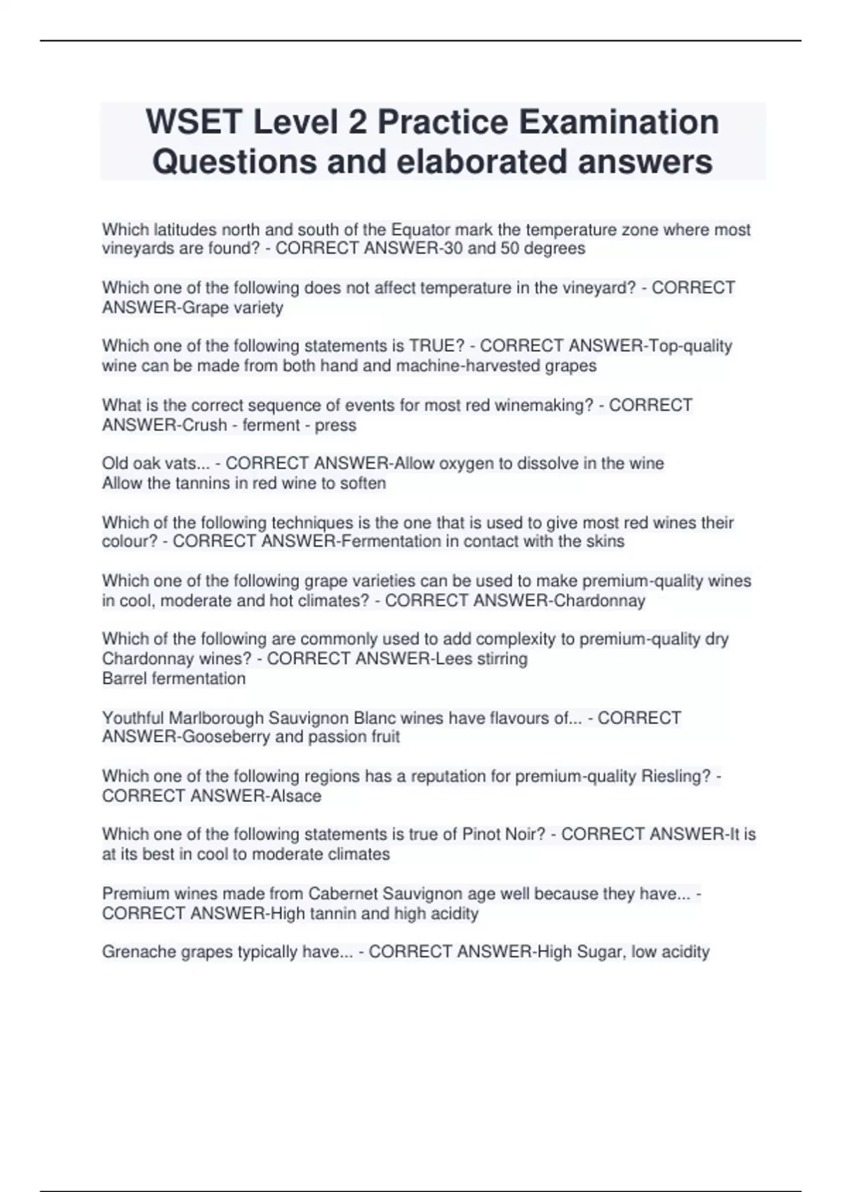 WSET Level 2 Practice Examination Questions and elaborated answers Which latitudes north and south of the Equator mark the temperature zone where most vineyards are found? - CORRECT ANSWER-30 and 50 degrees Which one of the following does not affect temperature in the vineyard? - CORRECT ANSWER-Grape variety Which one of the following statements is TRUE? - CORRECT ANSWER-Top-quality wine can be made from both hand and machine-harvested grapes What is the correct sequence of events for most red winemaking? - CORRECT ANSWER-Crush - ferment - press Old oak vats... - CORRECT ANSWER-Allow oxygen to dissolve in the wine Allow the tannins in red wine to soften Which of the following techniques is the one that is used to give most red wines their colour? - CORRECT ANSWER-Fermentation in contact with the skins Which one of the following grape varieties can be used to make premium-quality wines in cool, moderate and hot climates? - CORRECT ANSWER-Chardonnay Which of the following are commonly used to add complexity to premium-quality dry Chardonnay wines? - CORRECT ANSWER-Lees stirring Barrel fermentation Youthful Marlborough Sauvignon Blanc wines have flavours of... - CORRECT ANSWER-Gooseberry and passion fruit Which one of the following regions has a reputation for premium-quality Riesling? - CORRECT ANSWER-Alsace Which one of the following statements is true of Pinot Noir? - CORRECT ANSWER-It is at its best in cool to moderate climates Premium wines made from Cabernet Sauvignon age well because they have... - CORRECT ANSWER-High tannin and high acidity Grenache grapes typically have... - CORRECT ANSWER-High Sugar, low acidity