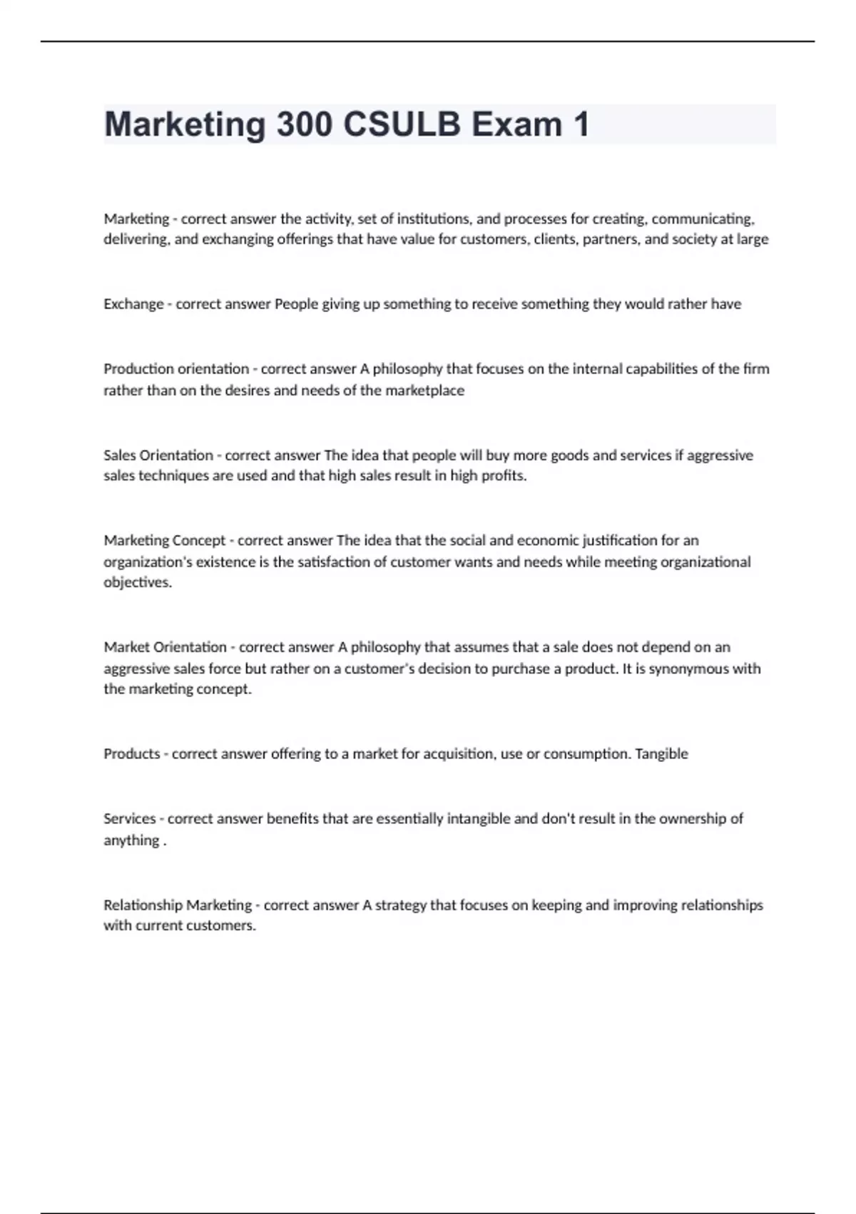 Relationship Marketing - correct answer A strategy that focuses on keeping and improving relationships with current customers. Societal marketing orientation - correct answer The idea that an organization exists not only to satisfy customer wants and needs and to meet organizational objectives, but also to preserve or enhance individuals' and society's long-term best interests.
