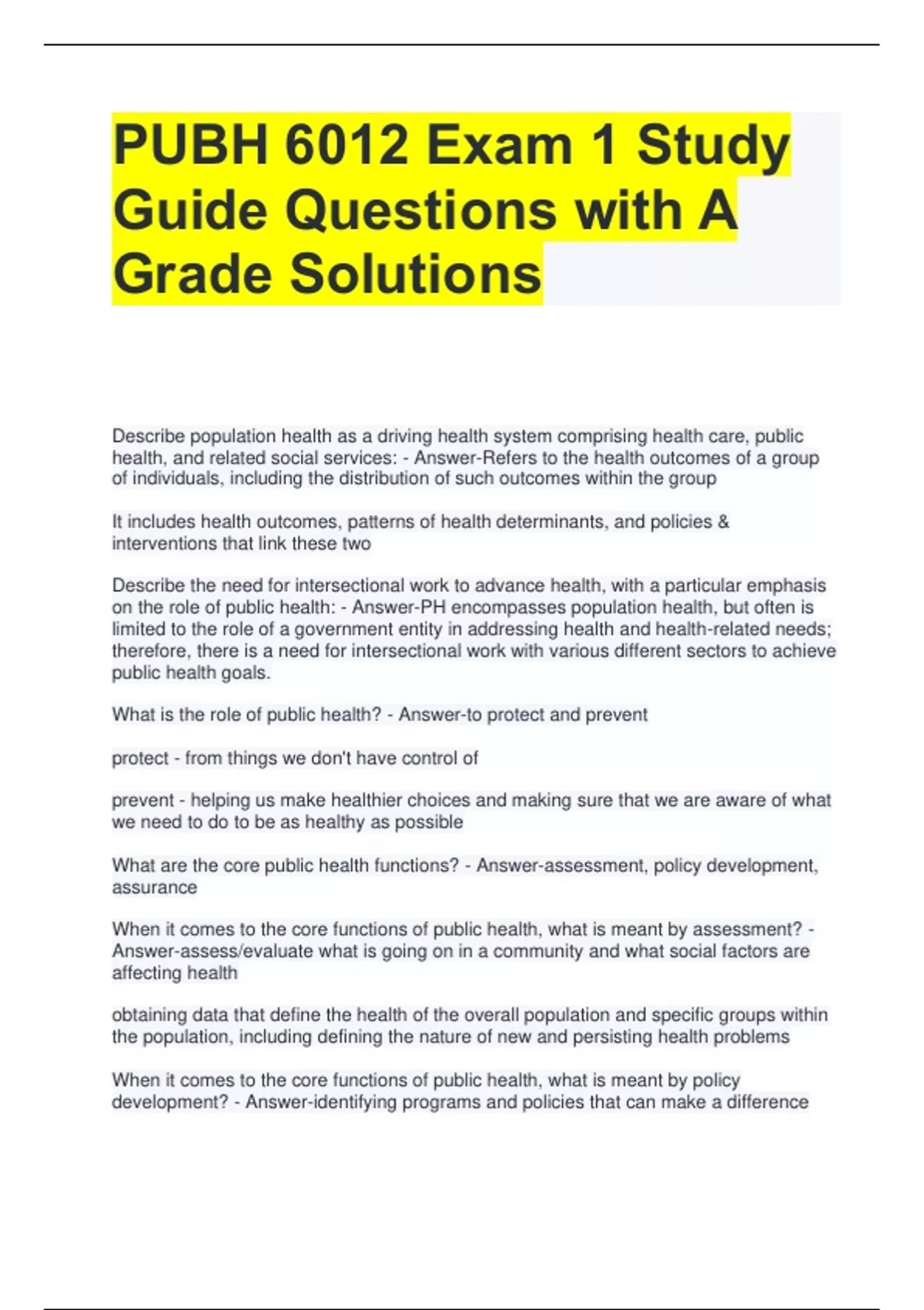 PUBH 6012 Exam 1 Study Guide Questions with A Grade Solutions Describe population health as a driving health system comprising health care, public health, and related social services: - Answer-Refers to the health outcomes of a group of individuals, including the distribution of such outcomes within the group It includes health outcomes, patterns of health determinants, and policies & interventions that link these two Describe the need for intersectional work to advance health, with a particular emphasis on the role of public health: - Answer-PH encompasses population health, but often is limited to the role of a government entity in addressing health and health-related needs; therefore, there is a need for intersectional work with various different sectors to achieve public health goals. What is the role of public health? - Answer-to protect and prevent protect - from things we don't have control of prevent - helping us make healthier choices and making sure that we are aware of what we need to do to be as healthy as possible What are the core public health functions? - Answer-assessment, policy development, assurance When it comes to the core functions of public health, what is meant by assessment? - Answer-assess/evaluate what is going on in a community and what social factors are affecting health obtaining data that define the health of the overall population and specific groups within the population, including defining the nature of new and persisting health problems When it comes to the core functions of public health, what is meant by policy development? - Answer-identifying programs and policies that can make a difference - developing evidence-based recommendations and other analyses of options, such as health policy analysis, to guide implementation, including efforts to educate and mobilize community partnerships