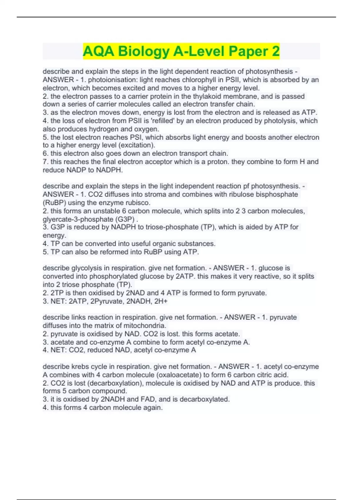 AQA Biology A-Level Paper 2 Exam Questions & Answers (Graded A+) AQA Biology A-Level Paper 2 Exam Questions & Answers (Graded A+) describe and explain the steps in the light dependent reaction of photosynthesis - ANSWER - 1. photoionisation: light reaches chlorophyll in PSII, which is absorbed by an electron, which becomes excited and moves to a higher energy level. 2. the electron passes to a carrier protein in the thylakoid membrane, and is passed down a series of carrier molecules called an electron transfer chain. 3. as the electron moves down, energy is lost from the electron and is released as ATP. 4. the loss of electron from PSII is 'refilled' by an electron produced by photolysis, which also produces hydrogen and oxygen. 5. the lost electron reaches PSI, which absorbs light energy and boosts another electron to a higher energy level (excitation). 6. this electron also goes down an electron transport chain. 7. this reaches the final electron acceptor which is a proton. they combine to form H and reduce NADP to NADPH. describe and explain the steps in the light independent reaction pf photosynthesis. - ANSWER - 1. CO2 diffuses into stroma and combines with ribulose bisphosphate (RuBP) using the enzyme rubisco. 2. this forms an unstable 6 carbon molecule, which splits into 2 3 carbon molecules, glyercate-3-phosphate (G3P) . 3. G3P is reduced by NADPH to triose-phosphate (TP), which is aided by ATP for energy. 4. TP can be converted into useful organic substances. 5. TP can also be reformed into RuBP using ATP. describe glycolysis in respiration. give net formation. - ANSWER - 1. glucose is converted into phosphorylated glucose by 2ATP. this makes it very reactive, so it splits into 2 triose phosphate (TP). 2. 2TP is then oxidised by 2NAD and 4 ATP is formed to form pyruvate. 3. NET: 2ATP, 2Pyruvate, 2NADH, 2H+ describe links reaction in respiration. give net formation. - ANSWER - 1. pyruvate diffuses into the matrix of mitochondria. 2. pyruvate is oxidised by NAD. CO2 is lost. this forms acetate. 3. acetate and co-enzyme A combine to form acetyl co-enzyme A. 4. NET: CO2, reduced NAD, acetyl co-enzyme A describe krebs cycle in respiration. give net formation. - ANSWER - 1. acetyl co-enzyme A combines with 4 carbon molecule (oxaloacetate) to form 6 carbon citric acid. 2. CO2 is lost (decarboxylation), molecule is oxidised by NAD and ATP is produce. this forms 5 carbon compound. 3. it is oxidised by 2NADH and FAD, and is decarboxylated. 4. this forms 4 carbon molecule again. describe oxidative phosphorylation in respiration. - ANSWER - 1. reduced coenzyme passes its H to a carrier protein in the ETC. this splits into a proton and electron. 2. the protons pass through the space between inner and outer mitochondrial membrane. 3. electrons pass through proteins on ETC. 4. protons return back via ATP synthase in the membrane, producing ATP. 5. the protons and electrons recombine to form H, which combines with O to form water. 6. oxygen is the last electron acceptor in the ETC. define biomass - ANSWER - the total mass of organisms in a given area what is the 'gross primary production'