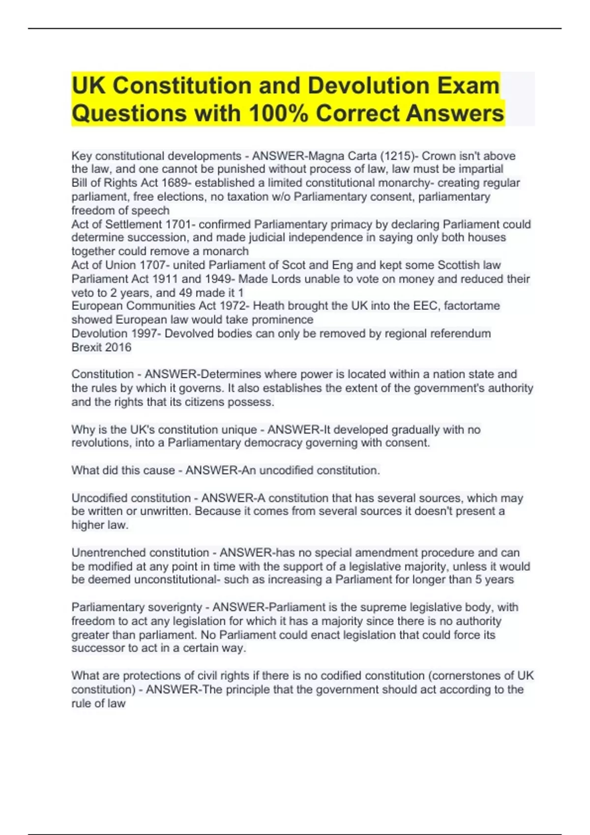 UK Constitution and Devolution Exam Questions with 100% Correct Answers