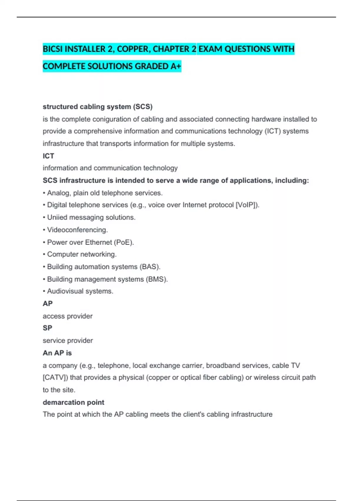 BICSI INSTALLER 2, COPPER, CHAPTER 2 EXAM QUESTIONS WITH COMPLETE SOLUTIONS GRADED A+ structured cabling system (SCS) is the complete coniguration of cabling and associated connecting hardware installed to provide a comprehensive information and communications technology (ICT) systems infrastructure that transports information for multiple systems. ICT information and communication technology SCS infrastructure is intended to serve a wide range of applications, including: • Analog, plain old telephone services. • Digital telephone services (e.g., voice over Internet protocol [VoIP]). • Uniied messaging solutions. • Videoconferencing. • Power over Ethernet (PoE). • Computer networking. • Building automation systems (BAS). • Building management systems (BMS). • Audiovisual systems. AP access provider SP service provider An AP is a company (e.g., telephone, local exchange carrier, broadband services, cable TV [CATV]) that provides a physical (copper or optical fiber cabling) or wireless circuit path to the site. demarcation point The point at which the AP cabling meets the client's cabling infrastructure An SP is the operator of any service that furnishes telecommunications content delivered over AP facilities. Standards provide the following beneits: • Consistency of design and installation. • Conformance to physical and transmission requirements. • A basis for examining a proposed system expansion. • Uniform documentation. An SCS includes most or all of the following components: • Backbone cabling and associated pathways. • Cross-connection facilities. • Interconnection facilities • Horizontal cabling and associated pathways • Work areas. • Telecommunications outlets/connectors. • Consolidation points (CPs). • Multi-user telecommunications outlet assemblies (MUTOAs). • Transition points (TPs). • Centralized cabling. • Distributed cabling. • Administration (e.g., labeling, documentation). Backbone Cabling the cabling and related components that are used between the spaces within an ICT systems cabling structure, such telecommunications rooms (TRs), equipment rooms (ERs), and telecommunications enclosures (TEs), that handle the majority of network