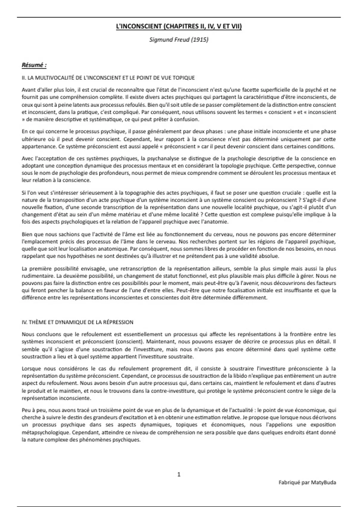 Résumé, explication et conclusion, et idées principales du texte 'L'inconscient (chapitres II, IV, V et VII)' de Freud.