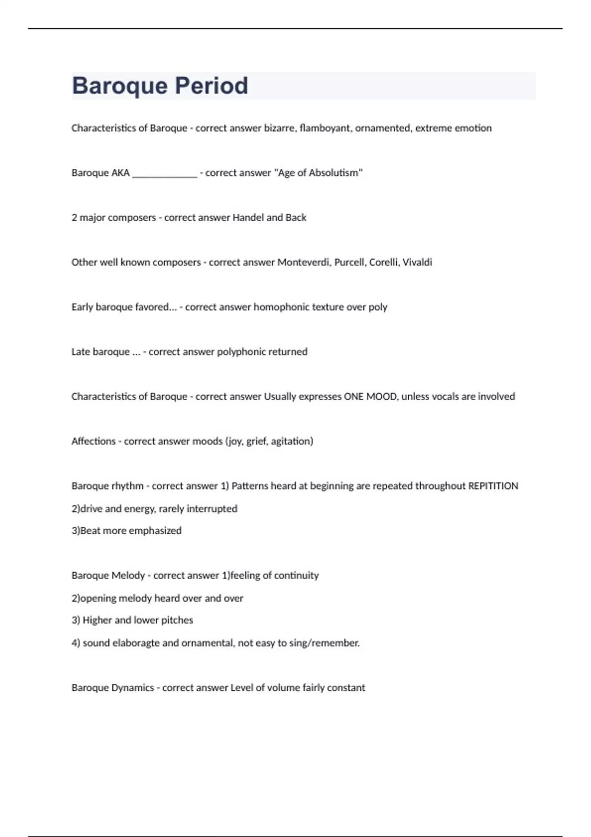 Baroque Period Exam Questions Correctly Answered 2024. Characteristics of Baroque - correct answer bizarre, flamboyant, ornamented, extreme emotion Baroque AKA ____________ - correct answer "Age of Absolutism" 2 major composers - correct answer Handel and Back Other well known composers - correct answer Monteverdi, Purcell, Corelli, Vivaldi Early baroque favored... - correct answer homophonic texture over poly Late baroque ... - correct answer polyphonic returned Characteristics of Baroque - correct answer Usually expresses ONE MOOD, unless vocals are involved Affections - correct answer moods (joy, grief, agitation) Baroque rhythm - correct answer 1) Patterns heard at beginning are repeated throughout REPITITION 2)drive and energy, rarely interrupted 3)Beat more emphasized Baroque Melody - correct answer 1)feeling of continuity 2)opening melody heard over and over 3) Higher and lower pitches 4) sound elaboragte and ornamental, not easy to sing/remember. Baroque Dynamics - correct answer Level of volume fairly constant When shift occurs, it's sudden Terraced Dynamics - correct answer Alternating dynamics between loud and soft. Main keyboard instruments - correct answer Organ, harpsichord, clavichord Baroque Texture - correct answer Late: polyphonic Imitations between lines common Basso Continuo - correct answer most characteristic part of this period Basso continuo, 2 instruments - correct answer Keyboard (organ or harpsichord) Low melody instrument (cello or bassoon)