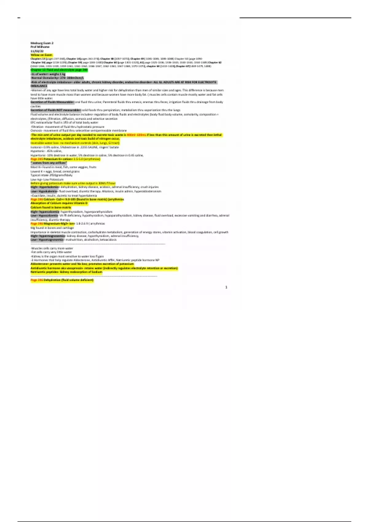 Medsurg Exam 2 Prof Milhome 11/03/22 Yellow on Exam Chapters 13 (pages 237-260), Chapter 14(pages 261-274); Chapter 48 (); Chapter 49 ( ; ) Chapter 50 (page 1094- Chapter 56( page ) ,Chapter 59( page ) Chapter 60 (page ), 61( page ; ; ; ) Chapter 62 (; ; ; ; ; ; ; ), chapter 64 (),Chapter 67(; 1488) Chapter 13 Fluid and electrolyte page 240 -1L of water= weighs 1 kg -Normal Osmolarity= 270- 300mOsm/L -Risk of electrolyte imbalance= older adults, chronic kidney disorder, endocrine disorder= ALL ILL ADULTS ARE AT RISK FOR ELECTROLYTE IMBALANCE -Women of any age have less total body water and higher risk for dehydration than men of similar sizes and ages. This difference is because men tend to have more muscle mass than women and because women have more body fat. ( muscles cells contain muscle mostly water and fat cells have little water. Excretion of Fluids Measurable= oral fluid thru urine; Parenteral fluids thru emesis; enemas thru feces; irrigation fluids thru drainage from body cavities Excretion of Fluids NOT measurable= solid foods thru perspiration; metabolism thru vaporization thru the lungs Fluid volume and electrolyte balance includes= regulation of body fluids and electrolytes (body fluid body volume, osmolarity, composition = electrolytes, (filtration, diffusion, osmosis and selective secretion EFC extracellular fluid is 1/3 of of total body water -filtration- movement of fluid thru hydrostatic pressure Osmosis- movement of fluid thru seleceltive semipermeable membrane -The min amt of urine output per day needed to excrete toxic waste is 400ml- 600mL if less than this amount of urine is excreted then lethal electrolyte imbalances, acidosis and toxic build of nitrogen occur, Insensible water loss- no mechanism controls (skin, lungs, GI tract) Isotonic= 0.9% saline, 5%dextrose in .2255 SALINE, ringers' lactate Hypotonic- .45% saline, Hypertonic- 10% dextrose in water, 5% dextrose in saline, 5% dextrose in 0.45 saline, Page 245 Potassium K+ cation= 3.5-5.0 (arrythmias) “ comes from any orifices” Most K= Found in meat, fish, some veggies, fruits Lowest K = eggs, bread, cereal grains Typical intake 2/20grams/daily Low mg= Low Potassium Before giving potassium make sure urine output is 30ML / hour High= Hyperkalemia= dehydration, kidney disease, acidosis, adrenal insufficiency, crush injuries Low= Hypokalemia= fluid overload, diuretic therapy. Alkalosis, insulin admin, hyperaldosteronism =Exactilate, insulin, duiretic to treat hyperkalemia Page 246 Calcium- Ca2+= 9.0-105 (found in bone matric) (arrythmias Absorption of Calcium requires Vitamin D Calcium found in bone matrix High= hypercalcemia- hyperthyroidism, hyperparathyroidism Low= Hypocalcemia- Vit D deficiency, hypothyroidism, hypoparathyroidism, kidney disease, fluid overload, excessive vomiting and diarrhea, adrenal insufficiency, diuretic therapy Page 246 Magnesium-Mg2+ ion= 1.8-2.6 9 ( arrythmias Mg found in bones and cartilage Importance in skeletal muscle contraction, carbohydrate metabolism, generation of energy stores, vitamin activation, blood coagulation, cell growth High= hypermagnesemia= kidney disease, hypothyroidism, adrenal insufficiency, Low= Hypomagnesemia= malnutrition, alcoholism, ketoacidosis ------------------------------------------------------------------------------------------------------------------------------------- -Muscles cells carry more water -Fat cells carry very little water -Kidney is the organ most sensitive to water loss / gain -3 Hormones that help regulate Aldosterone, Antidiuretic ADH, Natriuretic peptide hormone NP Aldosterone= prevents water and Na loss; promotes excretion of potassium Antidiuretic hormone aka vasopressin- retains water (indirectly regulates electrolyte retention or excretion) Natriuretic peptides- kidney reabsorption of Sodium ----------------------------------------------------------------------------------------------------------------------------- Page 246 Dehydration (fluid volume deficient)