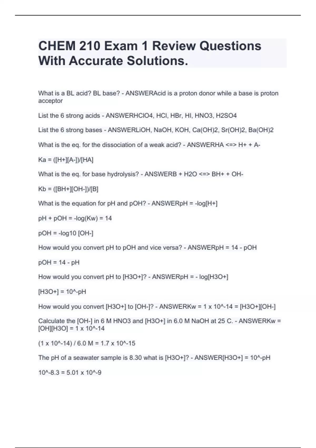 What is a BL acid? BL base? - ANSWERAcid is a proton donor while a base is proton acceptor List the 6 strong acids - ANSWERHClO4, HCl, HBr, HI, HNO3, H2SO4 List the 6 strong bases - ANSWERLiOH, NaOH, KOH, Ca(OH)2, Sr(OH)2, Ba(OH)2 What is the eq. for the dissociation of a weak acid? - ANSWERHA <=> H+ + A- Ka = ([H+][A-])/[HA] What is the eq. for base hydrolysis? - ANSWERB + H2O <=> BH+ + OH- Kb = ([BH+][OH-])/[B] What is the equation for pH and pOH? - ANSWERpH = -log[H+] pH + pOH = -log(Kw) = 14 pOH = -log10 [OH-] How would you convert pH to pOH and vice versa? - ANSWERpH = 14 - pOH pOH = 14 - pH How would you convert pH to [H3O+]? - ANSWERpH = - log[H3O+] [H3O+] = 10^-pH