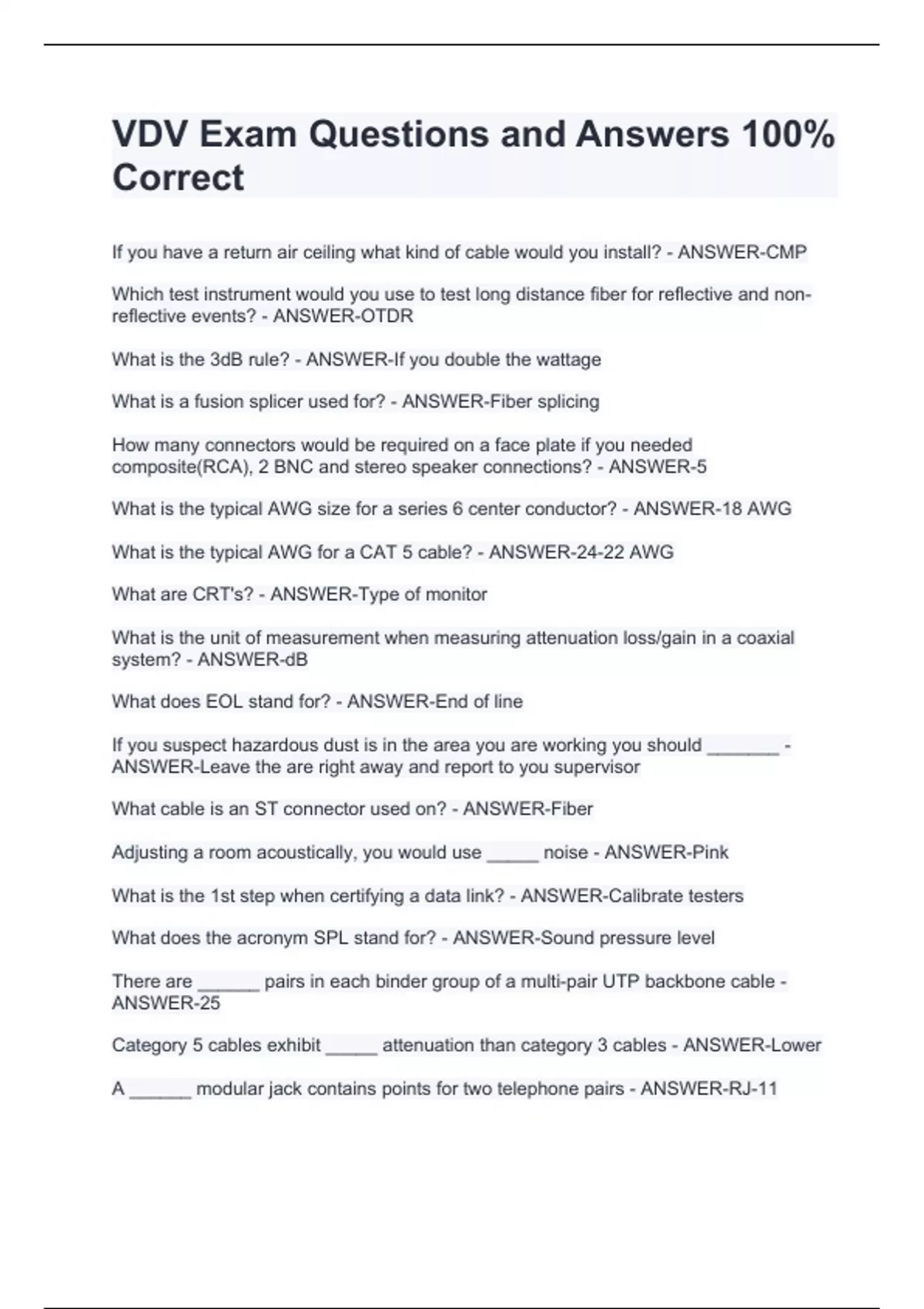 VDV Exam Questions and Answers 100% CorrectVDV Exam Questions and Answers 100% CorrectVDV Exam Questions and Answers 100% CorrectVDV Exam Questions and Answers 100% CorrectIf you have a return air ceiling what kind of cable would you install? - ANSWER-CMP Which test instrument would you use to test long distance fiber for reflective and non-reflective events? - ANSWER-OTDR What is the 3dB rule? - ANSWER-If you double the wattage