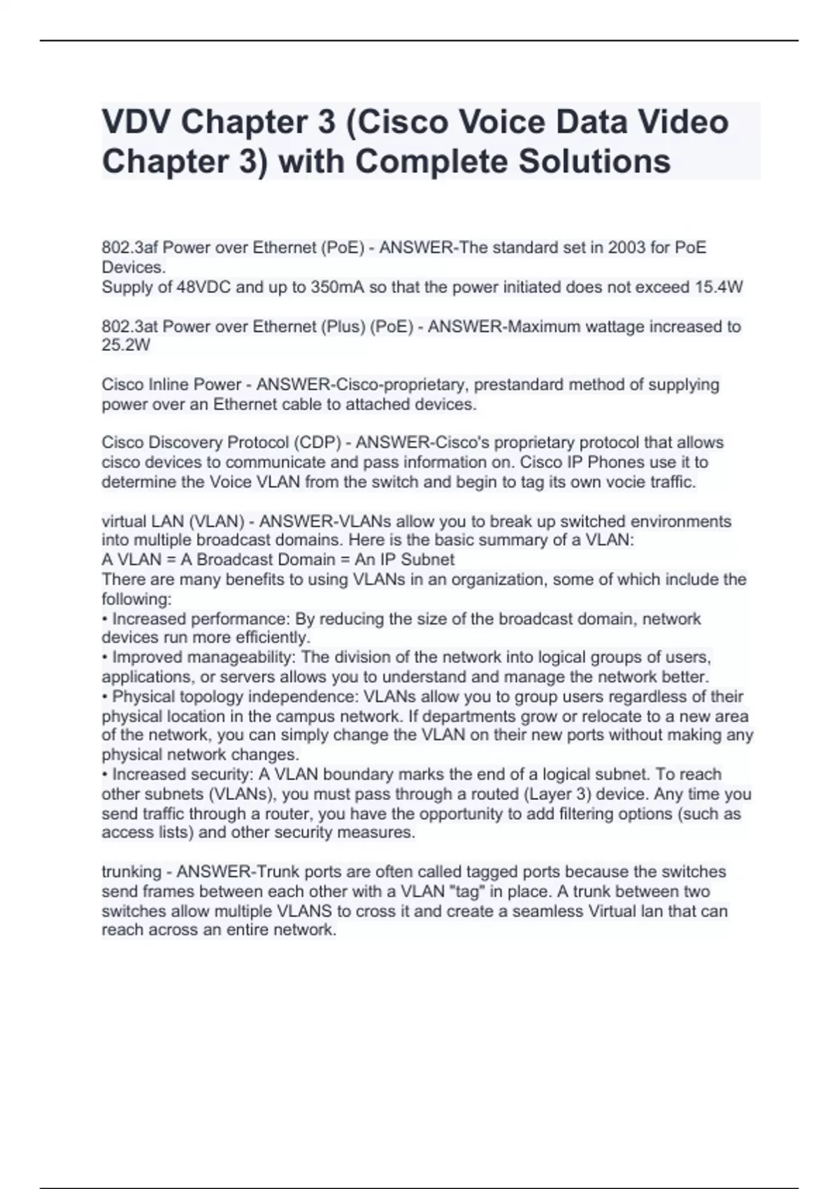 VDV Chapter 3 (Cisco Voice Data Video Chapter 3) with Complete SolutionsVDV Chapter 3 (Cisco Voice Data Video Chapter 3) with Complete SolutionsVDV Chapter 3 (Cisco Voice Data Video Chapter 3) with Complete SolutionsVDV Chapter 3 (Cisco Voice Data Video Chapter 3) with Complete Solutions 802.3af Power over Ethernet (PoE) - ANSWER-The standard set in 2003 for PoE Devices. Supply of 48VDC and up to 350mA so that the power initiated does not exceed 15.4W 802.3at Power over Ethernet (Plus) (PoE) - ANSWER-Maximum wattage increased to 25.2W Cisco Inline Power - ANSWER-Cisco-proprietary, prestandard method of supplying power over an Ethernet cable to attached devices. Cisco Discovery Protocol (CDP) - ANSWER-Cisco's proprietary protocol that allows cisco devices to communicate and pass information on. Cisco IP Phones use it to