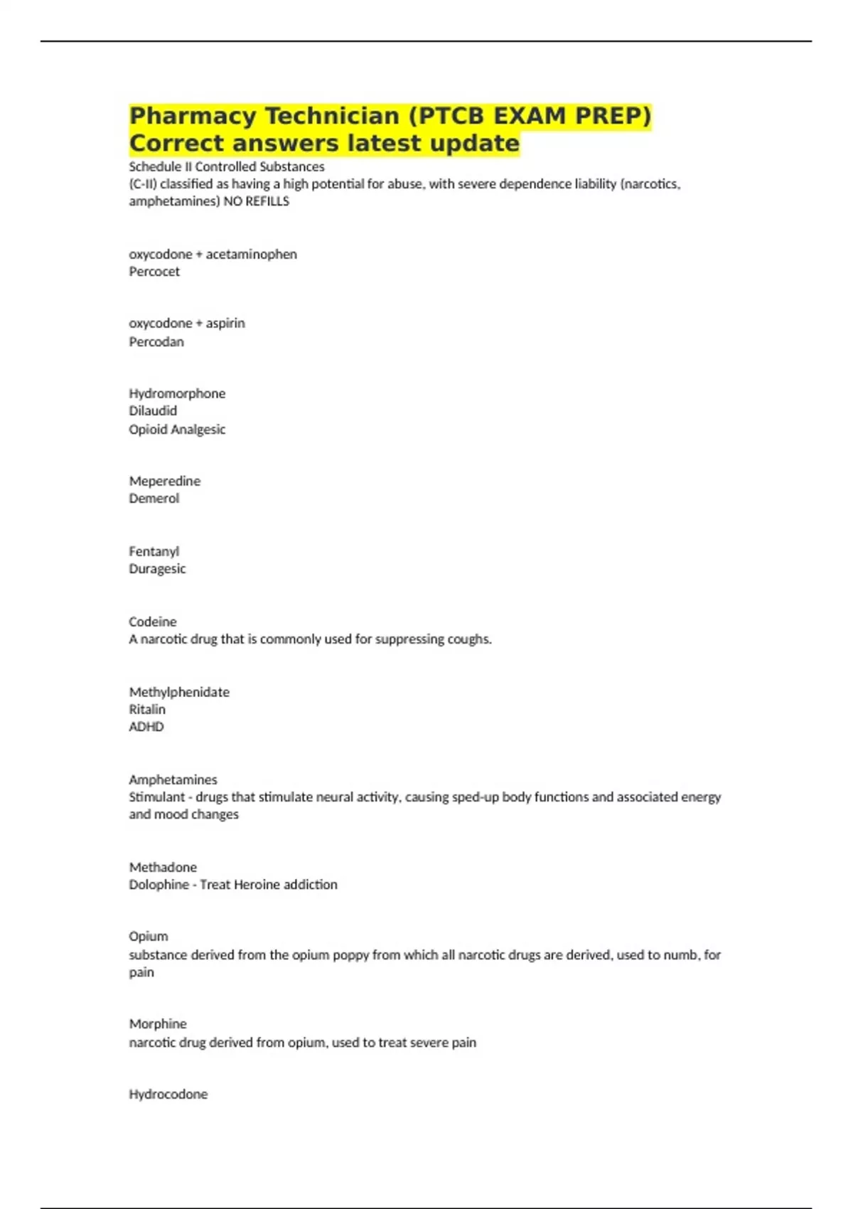 Pharmacy Technician (PTCB EXAM PREP) Correct answers latest update Schedule II Controlled Substances (C-II) classified as having a high potential for abuse, with severe dependence liability (narcotics, amphetamines) NO REFILLS oxycodone + acetaminophen Percocet oxycodone + aspirin Percodan Hydromorphone Dilaudid Opioid Analgesic Meperedine Demerol Fentanyl Duragesic Codeine A narcotic drug that is commonly used for suppressing coughs. Methylphenidate Ritalin ADHD Amphetamines Stimulant - drugs that stimulate neural activity, causing sped-up body functions and associated energy and mood changes Methadone Dolophine - Treat Heroine addiction Opium substance derived from the opium poppy from which all narcotic drugs are derived, used to numb, for pain Morphine narcotic drug derived from opium, used to treat severe pain Hydrocodone Vicodin Schedule 3 controlled substances Substances with some potential for abuse and with currently accepted medical uses. Abuse may lead to moderate or low physical dependence or high psychological dependence. Examples - Acetaminophen/Codeine, Ketamine, Anabolic Steroids, Opium or Morphine Mixtures Schedule 4 controlled substances anticonvulsants, antianxiety agents: valium, phenobarb, meprobamate Anticonvulsants prevent or control seizures drugs used to treat mania and depression Benzodiazepines The most common group of antianxiety drugs, which includes Valium and Xanax. Diazepam Valium Anxiety Lorezapam Ativan Flurazepam Dalmane (Class Benzodiazepine) Phenobarbital Luminal Anticonvulsant Schedule 5 controlled substances Substances with very low potential for abuse and currently accepted medical uses. The substances have very limited physical or psychological dependence liability. Are considered OTC in some states Examples - Codeine mixtures, Ephedrine Diphenoxylate + Atropine Lomotil Antidiarrheal Promethazine + Codeine Phenergan with Codeine Guaifenesin/Codeine Robitussin AC, Cheratussin AC Pregnancy Categories A- Safe B- Problems in Animals, Not Humans C- Caution, if benefits outweigh the risks you can use it X- NEVER. Teratogenic known to have potential to cause developmental defects in the embryo or fetus Psycho pharmacology the study of the effects of drugs on mind and behavior Neurotransmitters Chemicals that transmit information from one neuron to another Serotonin, Dopamine, Epinephrine, Norepinephrine, Acetylcholine Depression A prolonged feeling of helplessness, hopelessness, and sadness TCAs (tricyclic antidepressants) Tricyclic antidepressants are a class of medications that are used primarily as antidepressants. Doxepin Sinequan TCA Imipramine Tofranil TCA Amitriptyline Elavil TCA Notriptyline Pamelor (TCA) SSRIs (selective serotonin reuptake inhibitors) a group of second-generation antidepressant drugs that increase serotonin activity specifically, without affecting other neurotransmitters Fluoxetine Prozac SSRI Sertraline Zoloft SSRI Paroxetine Paxil SSRI Citalopram Celexa SSRI Escitolopram Lexapro SSRI MAOIs (monoamine oxidase inhibitors) Antidepresents durgs that inhibit the enzyme that deatctiviates dopamine, norepiniphrine, and serotonin. MAOIs appear to be most effective for treating non-endogenous and atypical (random) depressions. Phenelzine Nardil MAO inhibitor SNRIs (serotonin-norepinephrine re-uptake inhibitors) Antidepressant drugs that treat major depressive disorder and can also treat anxiety disorders, obsessive-compulsive disorder, attention-deficit hyperactivity disorder, chronic neuropathic pain, fibromyalgia syndrome, and menopausal symptoms. Duloxetine Cymbalta SNRI Anxiety Disorders Psychological disorders characterized by distressing, persistent anxiety or maladaptive behaviors that reduce anxiety Alprazolam Xanax