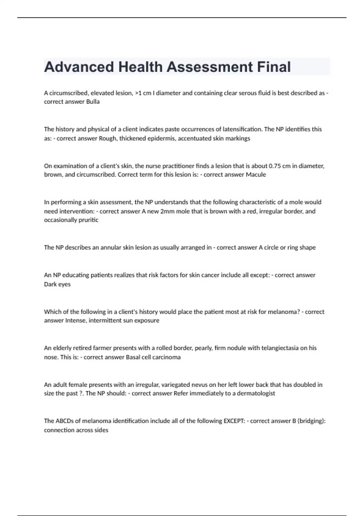 Advanced Health Assessment Final with correct answers A circumscribed, elevated lesion, >1 cm I diameter and containing clear serous fluid is best described as - correct answer Bulla The history and physical of a client indicates paste occurrences of latensification. The NP identifies this as: - correct answer Rough, thickened epidermis, accentuated skin markings On examination of a client's skin, the nurse practitioner finds a lesion that is about 0.75 cm in diameter, brown, and circumscribed. Correct term for this lesion is: - correct answer Macule In performing a skin assessment, the NP understands that the following characteristic of a mole would need intervention: - correct answer A new 2mm mole that is brown with a red, irregular border, and occasionally pruritic The NP describes an annular skin lesion as usually arranged in - correct answer A circle or ring shape An NP educating patients realizes that risk factors for skin cancer include all except: - correct answer Dark eyes Which of the following in a client's history would place the patient most at risk for melanoma? - correct answer Intense, intermittent sun exposure An elderly retired farmer presents with a rolled border, pearly, firm nodule with telangiectasia on his nose. This is: - correct answer Basal cell carcinoma An adult female presents with an irregular, variegated nevus on her left lower back that has doubled in size the past ?. The NP should: - correct answer Refer immediately to a dermatologist The ABCDs of melanoma identification include all of the following EXCEPT: - correct answer B (bridging): connection across sides