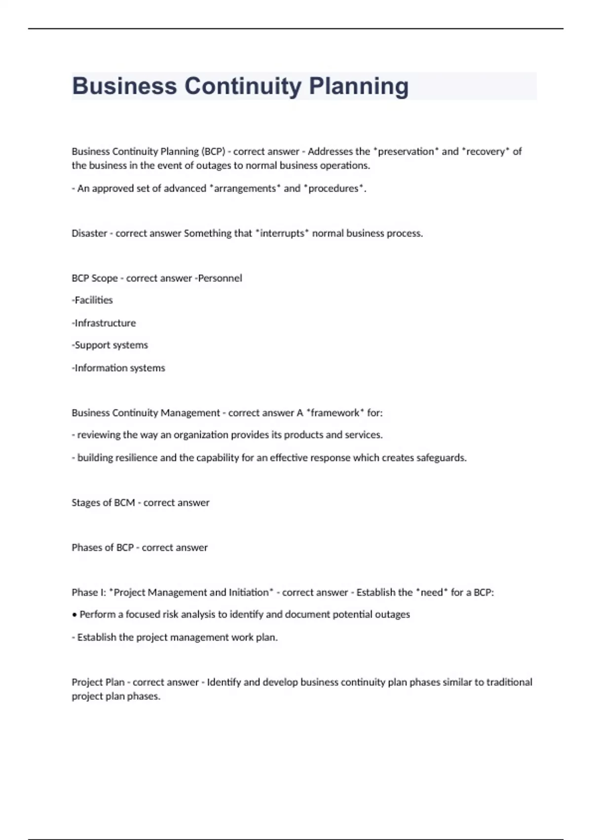 Business Continuity Planning Final Exam Questions And Answers. Business Continuity Planning (BCP) - correct answer - Addresses the *preservation* and *recovery* of the business in the event of outages to normal business operations. - An approved set of advanced *arrangements* and *procedures*. Disaster - correct answer Something that *interrupts* normal business process. BCP Scope - correct answer -Personnel -Facilities -Infrastructure -Support systems -Information systems Business Continuity Management - correct answer A *framework* for: - reviewing the way an organization provides its products and services. - building resilience and the capability for an effective response which creates safeguards. Stages of BCM - correct answer Phases of BCP - correct answer Phase I: *Project Management and Initiation* - correct answer - Establish the *need* for a BCP: • Perform a focused risk analysis to identify and document potential outages - Establish the project management work plan.