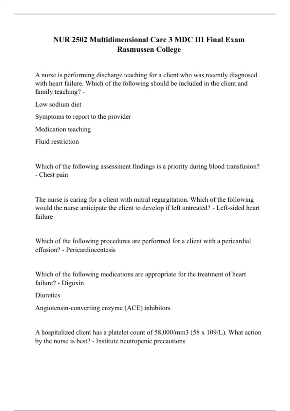 NUR 2502 Multidimensional Care 3 MDC III Final Exam Rasmussen College