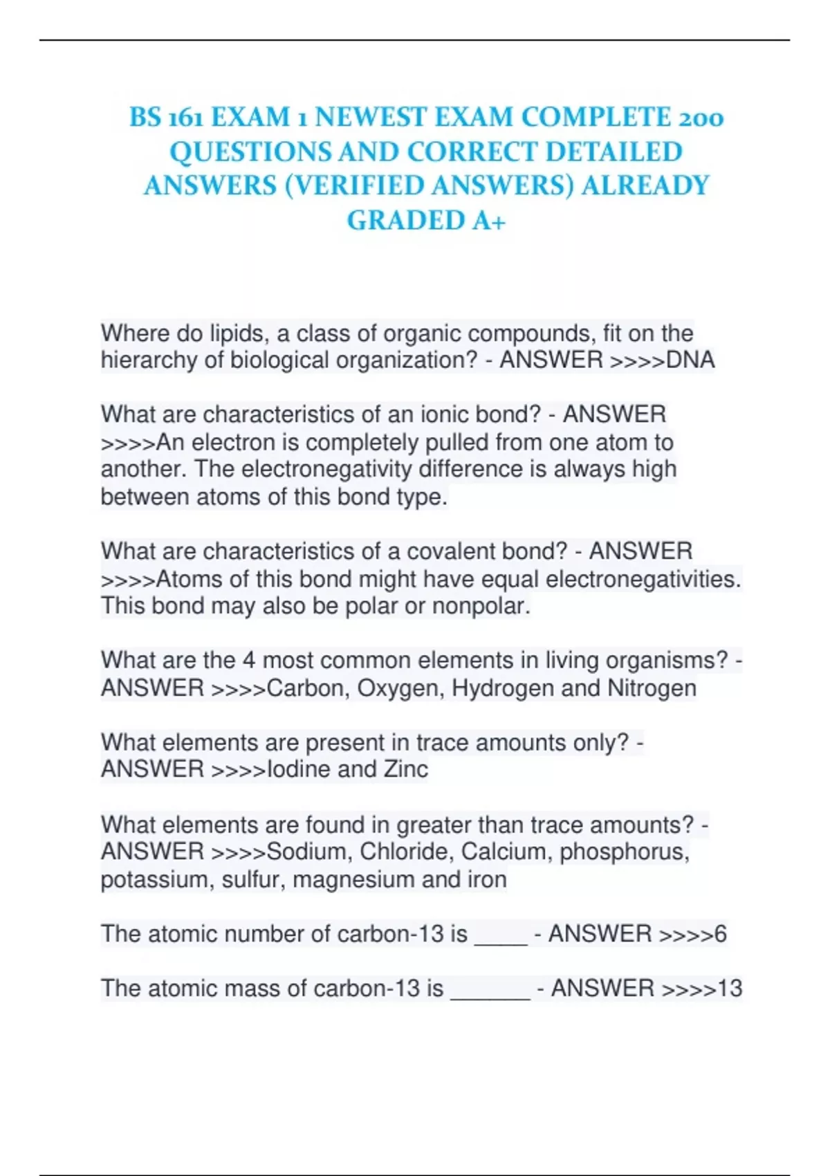 BS 161 EXAM 1 NEWEST EXAM COMPLETE 200 QUESTIONS AND CORRECT DETAILED