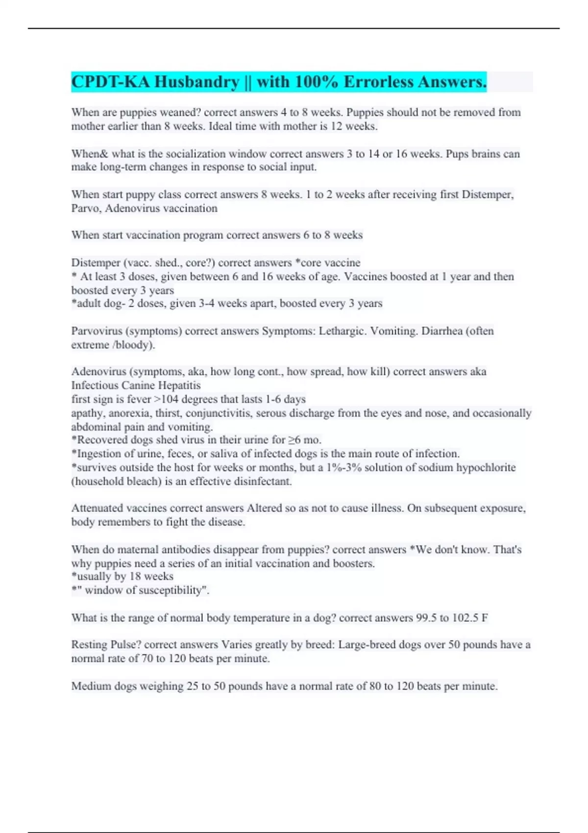 When are puppies weaned? correct answers 4 to 8 weeks. Puppies should not be removed from mother earlier than 8 weeks. Ideal time with mother is 12 weeks. When& what is the socialization window correct answers 3 to 14 or 16 weeks. Pups brains can make long-term changes in response to social input. When start puppy class correct answers 8 weeks. 1 to 2 weeks after receiving first Distemper, Parvo, Adenovirus vaccination When start vaccination program correct answers 6 to 8 weeks Distemper (vacc. shed., core?) correct answers *core vaccine * At least 3 doses, given between 6 and 16 weeks of age. Vaccines boosted at 1 year and then boosted every 3 years *adult dog- 2 doses, given 3-4 weeks apart, boosted every 3 years Parvovirus (symptoms) correct answers Symptoms: Lethargic. Vomiting. Diarrhea (often extreme /bloody). Adenovirus (symptoms, aka, how long cont., how spread, how kill) correct answers aka Infectious Canine Hepatitis first sign is fever 104 degrees that lasts 1-6 days apathy, anorexia, thirst, conjunctivitis, serous discharge from the eyes and nose, and occasionally abdominal pain and vomiting. *Recovered dogs shed virus in their urine for ≥6 mo. *Ingestion of urine, feces, or saliva of infected dogs is the main route of infection. *survives outside the host for weeks or months, but a 1%-3% solution of sodium hypochlorite (household bleach) is an effective disinfectant. Attenuated vaccines correct answers Altered so as not to cause illness. On subsequent exposure, body remembers to fight the disease. When do maternal antibodies disappear from puppies? correct answers *We don't know. That's why puppies need a series of an initial vaccination and boosters. *usually by 18 weeks *" window of susceptibility". What is the range of normal body temperature in a dog? correct answers 99.5 to 102.5 F Resting Pulse? correct answers Varies greatly by breed: Large-breed dogs over 50 pounds have a normal rate of 70 to 120 beats per minute. Medium dogs weighing 25 to 50 pounds have a normal rate of 80 to 120 beats per minute.