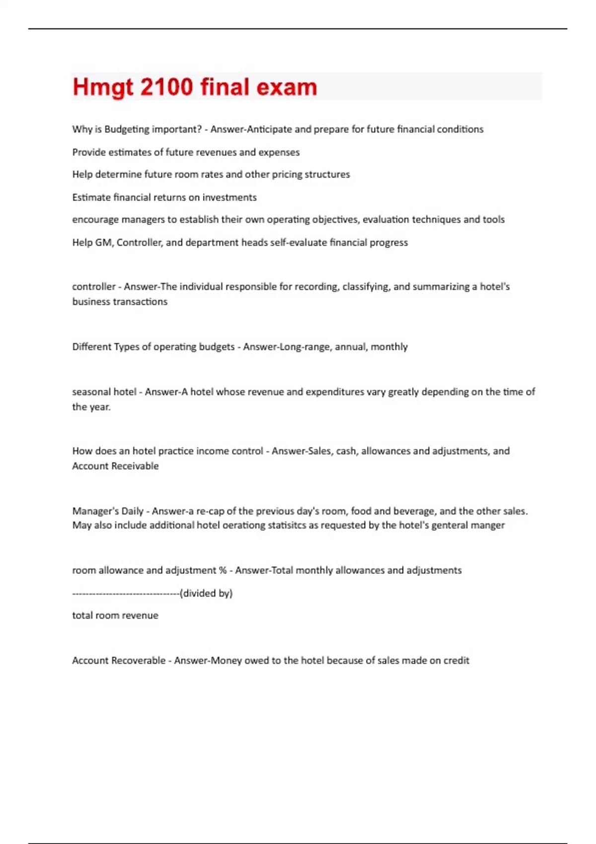 Why is Budgeting important? - Answer-Anticipate and prepare for future financial conditions Provide estimates of future revenues and expenses Help determine future room rates and other pricing structures Estimate financial returns on investments encourage managers to establish their own operating objectives, evaluation techniques and tools Help GM, Controller, and department heads self-evaluate financial progress controller - Answer-The individual responsible for recording, classifying, and summarizing a hotel's business transactions Different Types of operating budgets - Answer-Long-range, annual, monthly seasonal hotel - Answer-A hotel whose revenue and expenditures vary greatly depending on the time of the year. How does an hotel practice income control - Answer-Sales, cash, allowances and adjustments, and Account Receivable Manager's Daily - Answer-a re-cap of the previous day's room, food and beverage, and the other sales. May also include additional hotel oerationg statisitcs as requested by the hotel's genteral manger room allowance and adjustment % - Answer-Total monthly allowances and adjustments --------------------------------(divided by) total room revenue Account Recoverable - Answer-Money owed to the hotel because of sales made on creditAccounts receivable aging report - Answer-a process for determining the average length of time money is owed to a hotel because of a credit sale. write-off - Answer-A guest's direct bill that is considered uncollectible by management and as a result is subtracted for the hotel's accounts receivable total Account Payable - Answer-The sum total of all invoices owed by the hotel to its vendors for credit purchases made by the hotel Income Statement - Answer-Records the hotel's operating results for a specific time period. Also known as Profit and loss statement what does an Income statement tell - Answer-1. How will did the hotel perform during the time period 2. How well did the hotel perform compared to its estimate? 3. how well did the hotel perform compared to the same period last month, quarter, or year? 4. where did any significant financial changes from the previous time period occur. Balance sheet - Answer-Captures the overall financial position of a hotel at a specific point in time. Also a "Snapshot" of the hotel's financial health on a given date. Does NOT reflect how profitable the hotel's performance is. Statement of Cash Flows - Answer-tells you "how much cash was provided by the hotel's operation during the accounting period?" safety - Answer-protection of an individual's physical well-being and health security - Answer-protection of an individual's or business's property and other assets reasonable care - Answer-a legal concept identifying the amount of care a reasonable prudent person would exercise in a specific situation duty to care - Answer-hotel operators owe this to individuals who enter their establishment.Damages - Answer-the actual amount of losses or costs incurred due to the wrongful act of a liable party compensatory damages - Answer-a monetary amount intended to compensate injured parties for actual losses or damage they have incurred. This typically includes items such as medical bills and lost wages. AKA "actual damages" Punitive Damages - Answer-a monetary amount assessed to punishes liable parties and to serve as an example to the liable party as well as others not to commit the wrongful act act in the future.