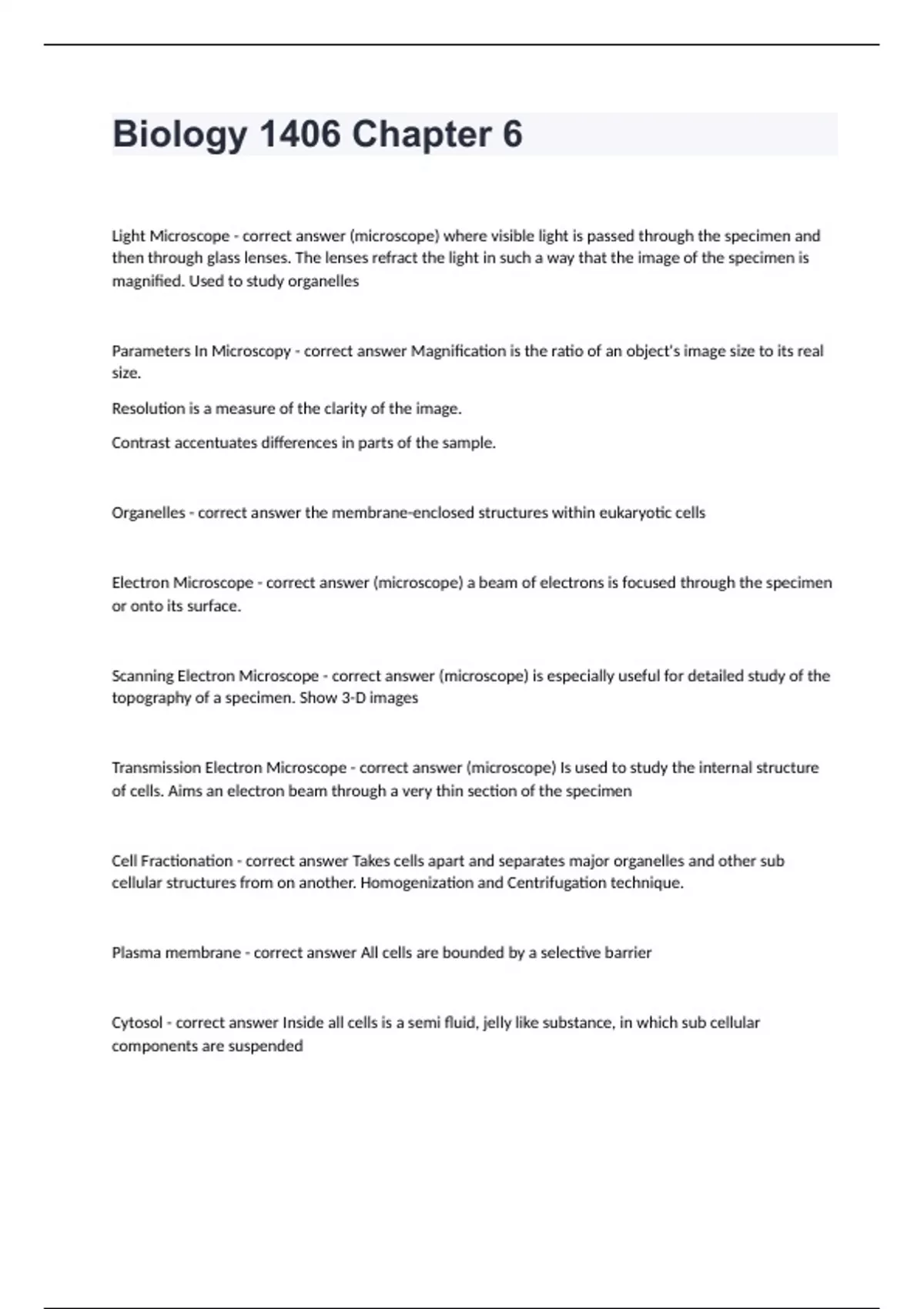 Biology 1406 Chapter 6 Collin College - Question and answers already pass Biology 1406 Chapter 6 Light Microscope - correct answer (microscope) where visible light is passed through the specimen and then through glass lenses. The lenses refract the light in such a way that the image of the specimen is magnified. Used to study organelles Parameters In Microscopy - correct answer Magnification is the ratio of an object's image size to its real size. Resolution is a measure of the clarity of the image. Contrast accentuates differences in parts of the sample. Organelles - correct answer the membrane-enclosed structures within eukaryotic cells Electron Microscope - correct answer (microscope) a beam of electrons is focused through the specimen or onto its surface.