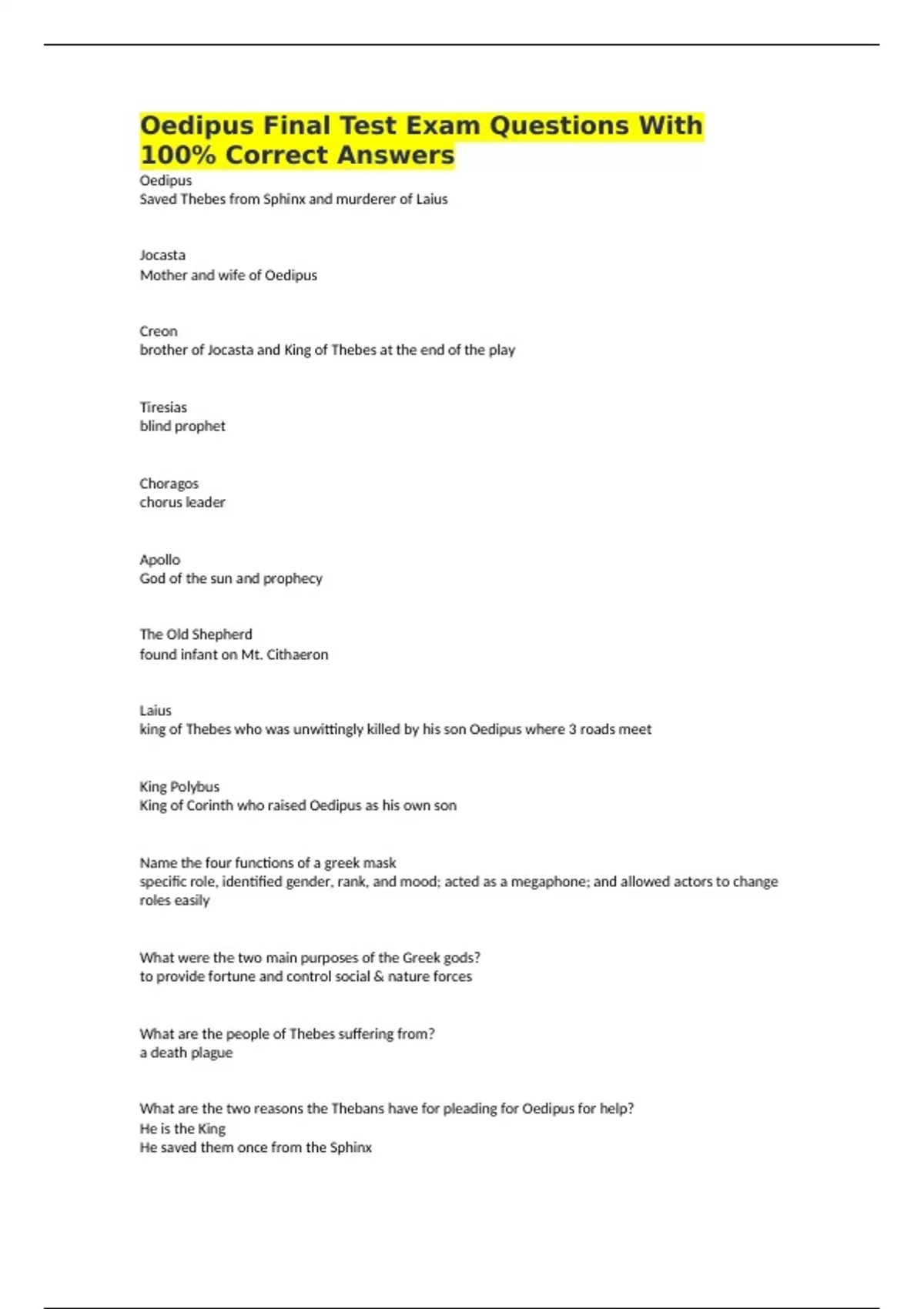 Oedipus Final Test Exam Questions With 100% Correct Answers Oedipus Saved Thebes from Sphinx and murderer of Laius Jocasta Mother and wife of Oedipus Creon brother of Jocasta and King of Thebes at the end of the play Tiresias blind prophet Choragos chorus leader Apollo God of the sun and prophecy The Old Shepherd found infant on Mt. Cithaeron Laius king of Thebes who was unwittingly killed by his son Oedipus where 3 roads meet King Polybus King of Corinth who raised Oedipus as his own son Name the four functions of a greek mask specific role, identified gender, rank, and mood; acted as a megaphone; and allowed actors to change roles easily What were the two main purposes of the Greek gods? to provide fortune and control social & nature forces What are the people of Thebes suffering from? a death plague What are the two reasons the Thebans have for pleading for Oedipus for help? He is the King He saved them once from the Sphinx What is an oracle? a divine message from the gods Who was murdered? King Lauis