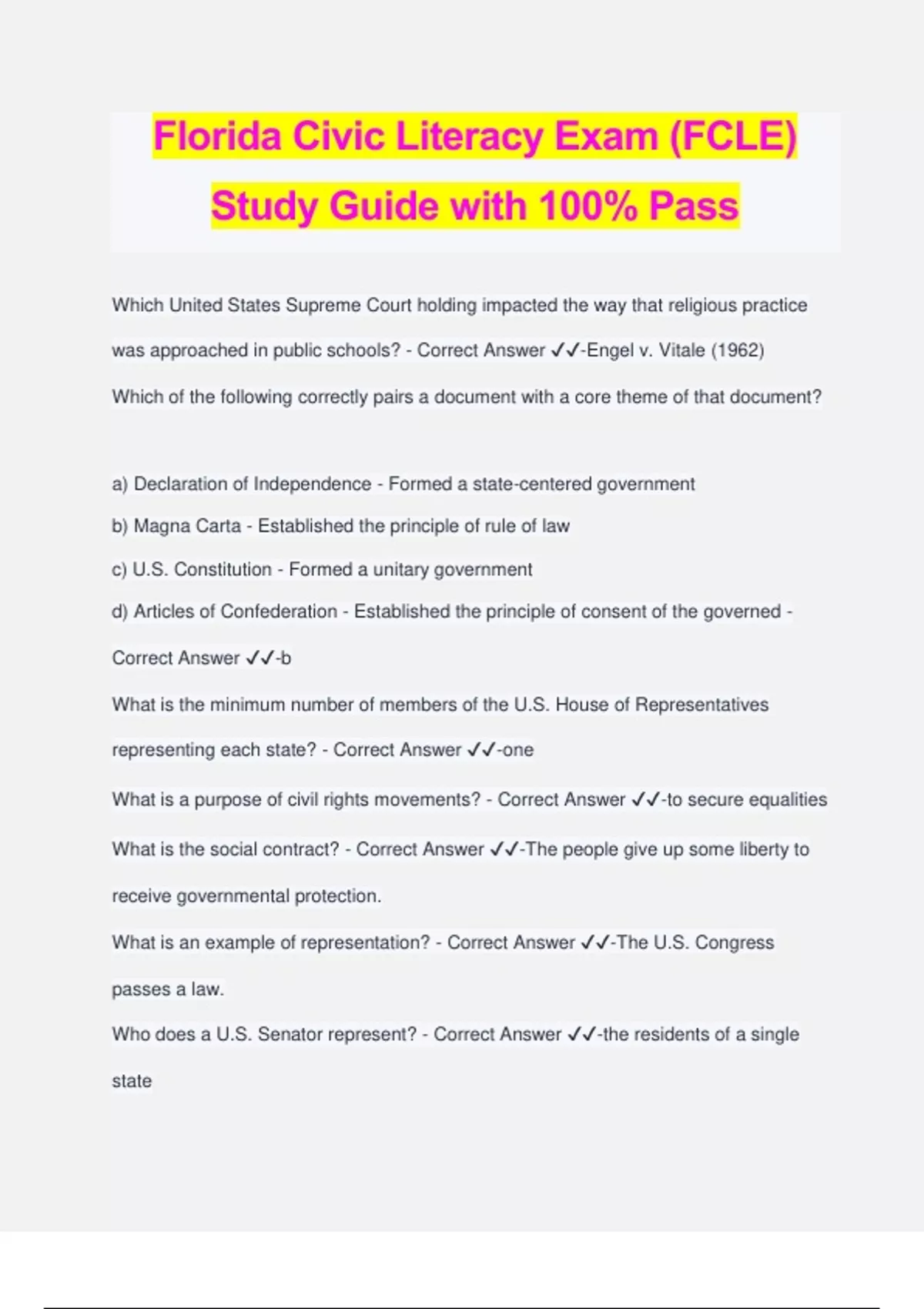 Florida Civic Literacy Exam (FCLE) Study Guide with 100% Pass Which United States Supreme Court holding impacted the way that religious practice was approached in public schools? - Correct Answer ️️ -Engel v. Vitale (1962) Which of the following correctly pairs a document with a core theme of that document? a) Declaration of Independence - Formed a state-centered government b) Magna Carta - Established the principle of rule of law c) U.S. Constitution - Formed a unitary government d) Articles of Confederation - Established the principle of consent of the governed - Correct Answer ️️ -b What is the minimum number of members of the U.S. House of Representatives representing each state? - Correct Answer ️️ -one What is a purpose of civil rights movements? - Correct Answer ️️ -to secure equalities What is the social contract? - Correct Answer ️️ -The people give up some liberty to receive governmental protection. What is an example of representation? - Correct Answer ️️ -The U.S. Congress passes a law. Who does a U.S. Senator represent? - Correct Answer ️️ -the residents of a single state Which of the following documents provided a rationale for the Declaration of Independence? - Correct Answer ️️ -Common Sense What are two natural rights identified in the Declaration of Independence? - Correct Answer ️️ -life and liberty How many U.S. Senators represent each state? - Correct Answer ️️ -two What is the length of a U.S. President's elected term? - Correct Answer ️️ -four years What is one branch of the U.S. federal government? - Correct Answer ️️ -legislative What does the U.S. Constitution do? - Correct Answer ️️ -It sets up a federal government. Which phrase from a letter written by Abigail Adams to her husband John Adams in 1776 is reflected in the Nineteenth Amendment? - Correct Answer ️️ -"I desire you would Remember the Ladies, and be more generous and favourable to them" Which phrase from a letter written by President Thomas Jefferson in 1802 reflects a freedom in the Bill of Rights? - Correct Answer ️️ -"building a wall of separation between Church & State" Which of the following pairs of cases focused on the rights of public school students? - Correct Answer ️️ -Tinker v. Des Moines (1969) and Hazelwood v. Kuhlmeier (1988) Who is in charge of the executive branch? - Correct Answer ️️ -the Pre