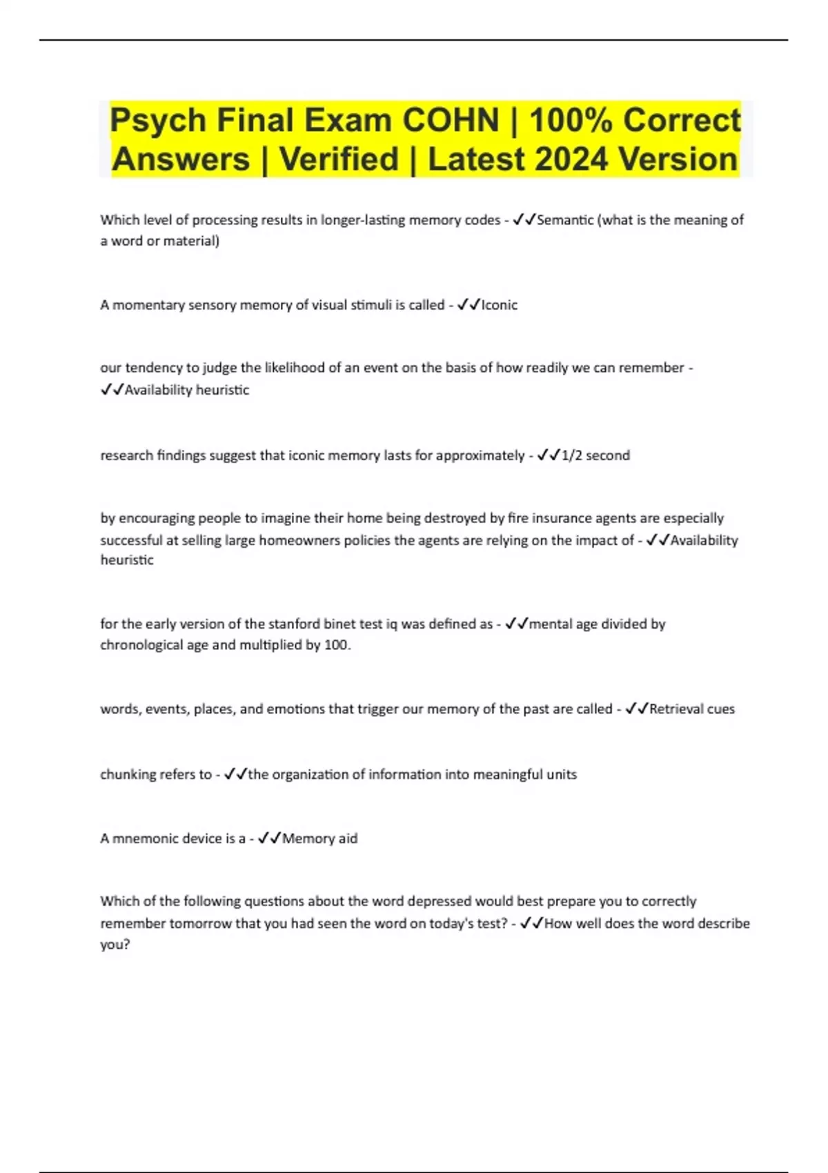 Psych Final Exam COHN | 100% Correct Answers | Verified | Latest 2024 Version