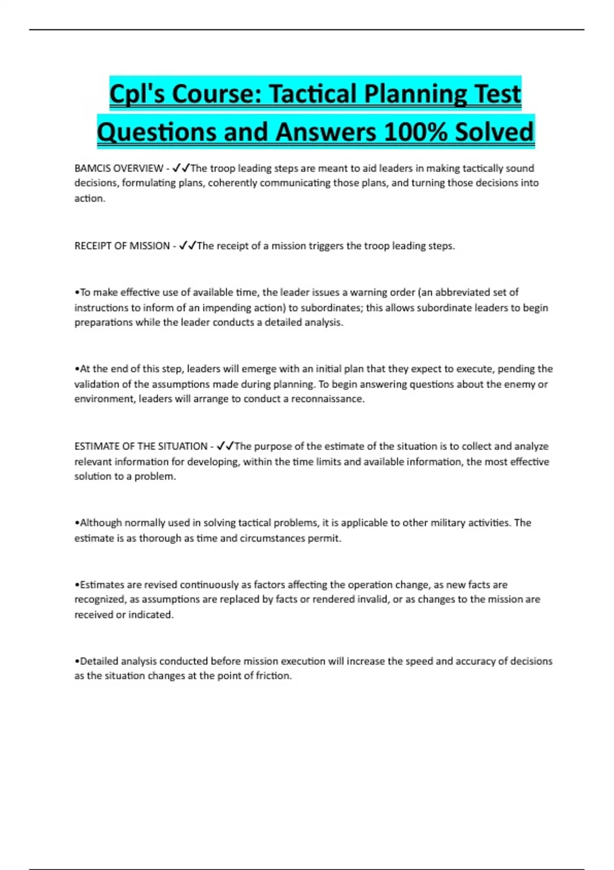 Cpl's Course: Tactical Planning Test Questions and Answers 100% Solved BAMCIS OVERVIEW - The troop leading steps are meant to aid leaders in making tactically sound decisions, formulating plans, coherently communicating those plans, and turning those decisions into action. RECEIPT OF MISSION - The receipt of a mission triggers the troop leading steps. •To make effective use of available time, the leader issues a warning order (an abbreviated set of instructions to inform of an impending action) to subordinates; this allows subordinate leaders to begin preparations while the leader conducts a detailed analysis.