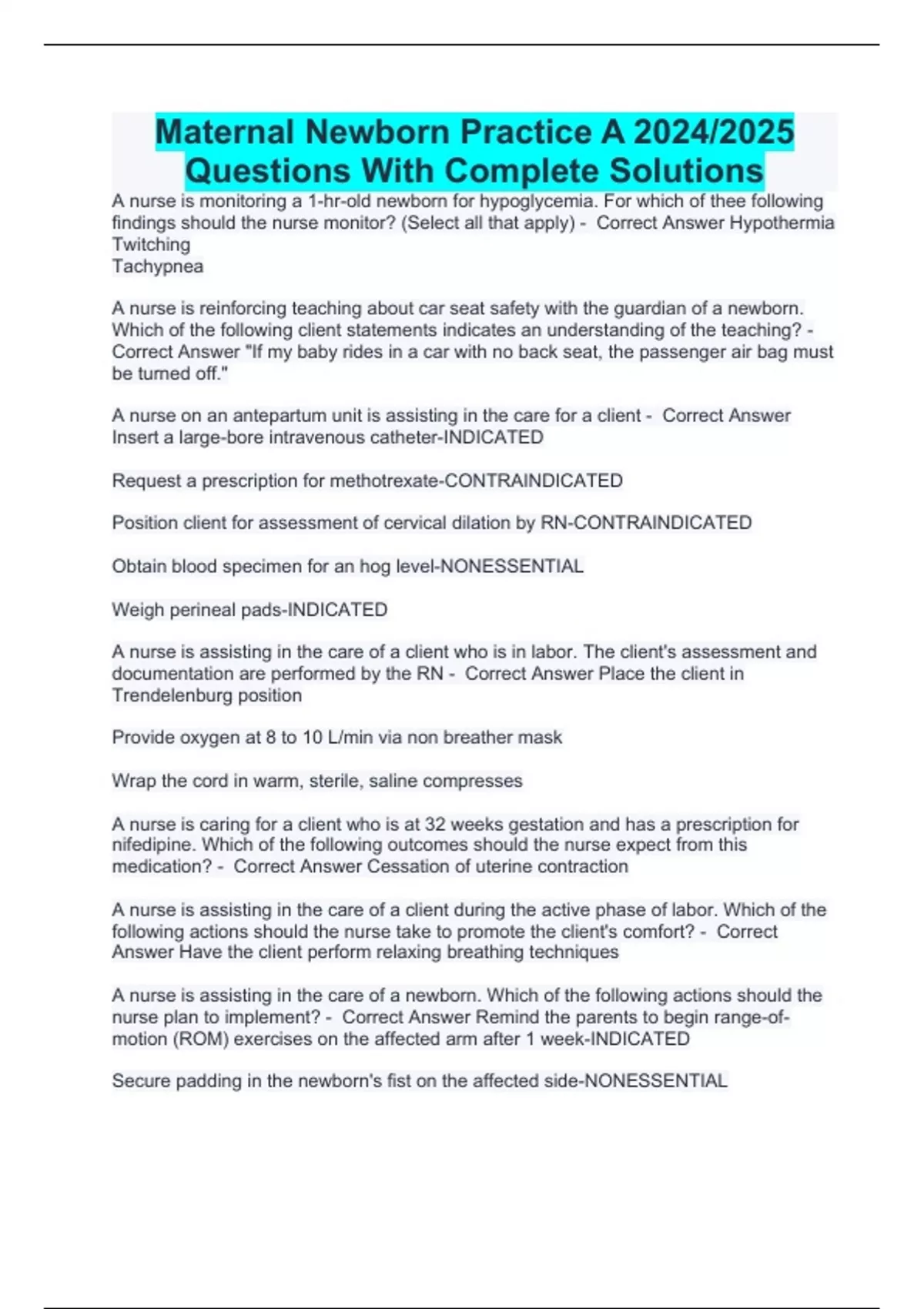 Maternal Newborn Practice A 2024/2025 Questions With Complete Solutions A nurse is monitoring a 1-hr-old newborn for hypoglycemia. For which of thee following findings should the nurse monitor? (Select all that apply) - Correct Answer Hypothermia Twitching Tachypnea A nurse is reinforcing teaching about car seat safety with the guardian of a newborn. Which of the following client statements indicates an understanding of the teaching? - Correct Answer "If my baby rides in a car with no back seat, the passenger air bag must be turned off." A nurse on an antepartum unit is assisting in the care for a client - Correct Answer Insert a large-bore intravenous catheter-INDICATED Request a prescription for methotrexate-CONTRAINDICATED Position client for assessment of cervical dilation by RN-CONTRAINDICATED Obtain blood specimen for an hog level-NONESSENTIAL Weigh perineal pads-INDICATED A nurse is assisting in the care of a client who is in labor. The client's assessment and documentation are performed by the RN - Correct Answer Place the client in Trendelenburg position Provide oxygen at 8 to 10 L/min via non breather mask Wrap the cord in warm, sterile, saline compresses A nurse is caring for a client who is at 32 weeks gestation and has a prescription for nifedipine. Which of the following outcomes should the nurse expect from this medication? - Correct Answer Cessation of uterine contraction A nurse is assisting in the care of a client during the active phase of labor. Which of the following actions should the nurse take to promote the client's comfort? - Correct Answer Have the client perform relaxing breathing techniques A nurse is assisting in the care of a newborn. Which