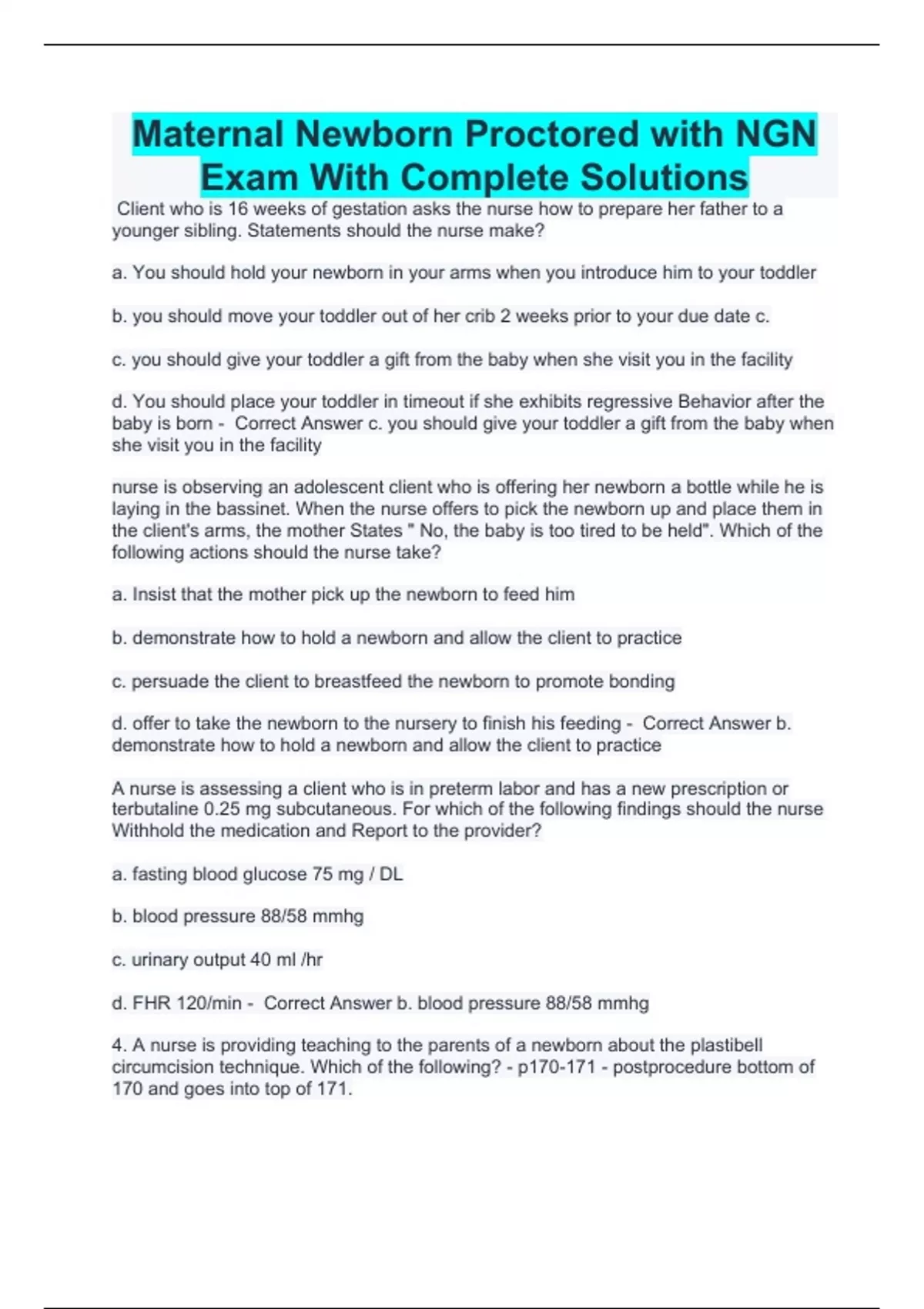 Maternal Newborn Proctored with NGN Exam With Complete Solutions Client who is 16 weeks of gestation asks the nurse how to prepare her father to a younger sibling. Statements should the nurse make? a. You should hold your newborn in your arms when you introduce him to your toddler b. you should move your toddler out of her crib 2 weeks prior to your due date c. c. you should give your toddler a gift from the baby when she visit you in the facility d. You should place your toddler in timeout if she exhibits regressive Behavior after the baby is born - Correct Answer c. you should give your toddler a gift from the baby when she visit you in the facility nurse is observing an adolescent client who is offering her newborn a bottle while he is laying in the bassinet. When the nurse offers to pick the newborn up and place them in the client's arms, the mother States " No, the baby is too tired to be held". Which of the following actions should the nurse take? a. Insist that the mother pick up the newborn to feed him b. demonstrate how to hold a newborn and allow the client to practice c. persuade the client to breastfeed the newborn to promote bonding d. offer to take the newborn to the nursery to finish his feeding - Correct Answer b. demonstrate how to hold a newborn and allow the client to practice A nurse is assessing a client who is in preterm labor and has a new prescription or terbutaline 0.25 mg subcutaneous. For which of the following findings should the nurse Withhold the medication and Report to the provider? a. fasting blood glucose 75 mg / DL b. blood pressure 88/58 mmhg c. urinary output 40 ml /hr d. FHR 120/min - Correct Answer b. blood pressure 88/58 mmhg Client who is 16 weeks of gestation asks the nurse how to prepare her father to a younger sibling. Statements should the nurse make? a. You should hold your newborn in your arms when you introduce him to your toddler b. you should move your toddler out of her crib 2 weeks prior to your due date c. c. you should give your toddler a gift from the baby when she visit you in the facility d. You should place your toddler in timeout if she exhibits regressive Behavior after the baby is born - Correct Answer c. you should give your toddler a gift from the baby when she visit you in the facility nurse is observing an adolescent client who is offering her newborn a bottle while he is laying in the bassinet. When the nurse offers to pick the newborn up and place them in the client's arms, the mother States " No, the baby is too tired to be held". Which of the following actions should the nurse take? a. Insist that the mother pick up the newborn to feed him b. demonstrate how to hold a newborn and allow the client to practice c. persuade the client to breastfeed the newborn to promote bonding d. offer to take the newborn to the nursery to finish his feeding - Correct Answer b. demonstrate how to hold a newborn and allow the client to practice A nurse is assessing a client who is in preterm labor and has a new prescription or terbutaline 0.25 mg subcutaneous. For which of the following findings should the nurse Withhold the medication and Report to the provider? a. fasting blood glucose 75 mg / DL b. blood pressure 88/58 mmhg c. urinary output 40 ml /hr d. FHR 120/min - Correct Answer b. blood pressure 88/58 mmhg
