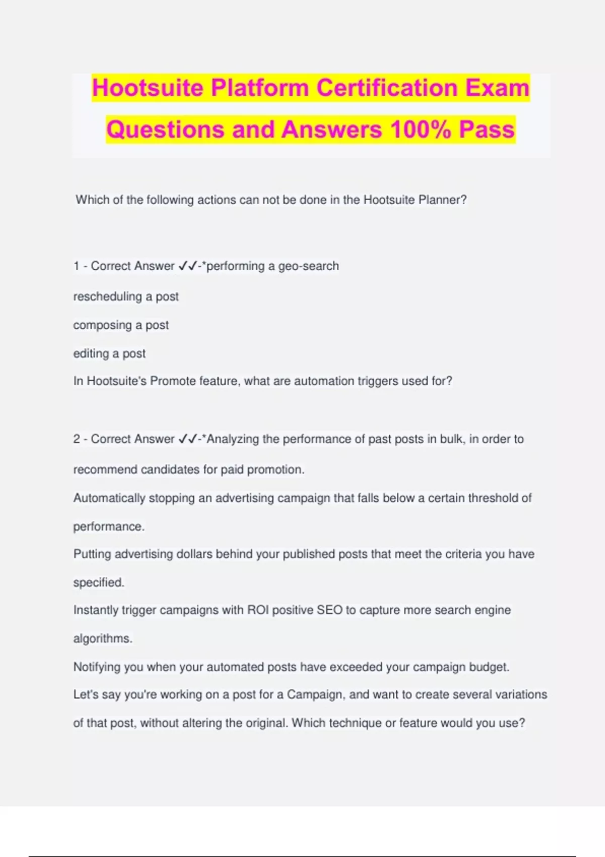 Hootsuite Platform Certification Exam Questions and Answers 100% Pass Which of the following actions can not be done in the Hootsuite Planner? 1 - Correct Answer ️️ -*performing a geo-search rescheduling a post composing a post editing a post In Hootsuite's Promote feature, what are automation triggers used for? 2 - Correct Answer ️️ -*Analyzing the performance of past posts in bulk, in order to recommend candidates for paid promotion. Automatically stopping an advertising campaign that falls below a certain threshold of performance. Putting advertising dollars behind your published posts that meet the criteria you have specified. Instantly trigger campaigns with ROI positive SEO to capture more search engine algorithms. Notifying you when your automated posts have exceeded your campaign budget. Let's say you're working on a post for a Campaign, and want to create several variations of that post, without altering the original. Which technique or feature would you use? 3 - Correct Answer ️️ -Draft Variant Array a Post *Duplicate a Draft Cascade a Message Duplicate a Campaign When using the Hootsuite Composer, what's the purpose of the social profile picker? 4 (Photo) - Correct Answer ️️ -To monitor account activity on your social accounts connected to Hootsuite. *To select the social profiles to which you want to publish your post. To connect an existing social media account (e.g., Facebook, LinkedIn) to your Hootsuite dashboard To create a network-specific search stream in the Engagement area. In Hootsuite Analytics, what is an advantage of sharing a Report with a colleague rather than sending them an exported pdf? 5 - Correct Answer ️️ -Reports predict what the recipient/stakeholder wants to see and tailors the information accordingly Reports include a chatbot that offers personalized recommendations on how to optimize your campaigns *Reports provide your colleagues with continuous access to updated data Reports feature a built-in ROI calculator that grades your company's social activities relative to your defined social media objectives Name the area pictured in the Hootsuite Mobile App 6 (Photo) - Correct Answer ️️ -Composer Streams Insights *Publisher Inbox Where in the dashboard would you primarily view and engage with your audience and the social media content published by others? 7 - Correct Answer ️️ -? The App Directory area The Composer area The Boards and Streams area *The content library area Say you're drafting a batch of social posts as part of a campaign. You need to access brand-approved visual assets stored on Google Drive to include in
