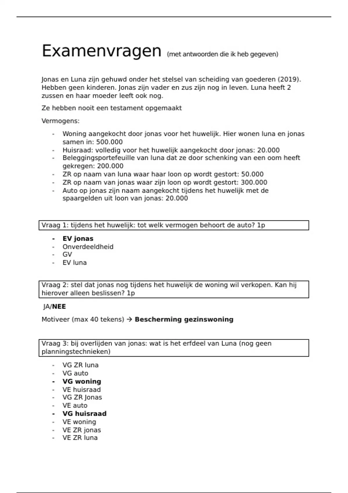 Vraag 1: tijdens het huwelijk: tot welk vermogen behoort de auto? 1p
