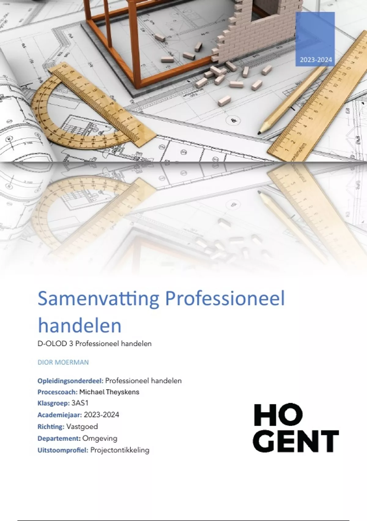 Dit is een volledige samenvatting van |D-OLOD 3 Professioneel handelen| in het uitstroomprofiel Projectontwikkelaar . Ikzelf was aanwezig bij alle hoor- en gastcolleges en maakte mijn aantekeningen telkens zelf en verwerkte de PowerPoints, ook examenvragen die vermeld werden zitten in mijn samenvatting vervat. Indien vragen stuur gerust een bericht.