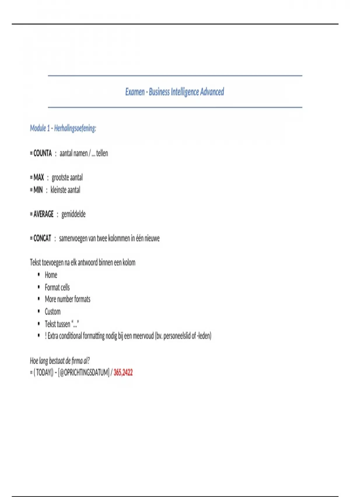 Samenvatting Overzicht formules Business Intelligence Advanced