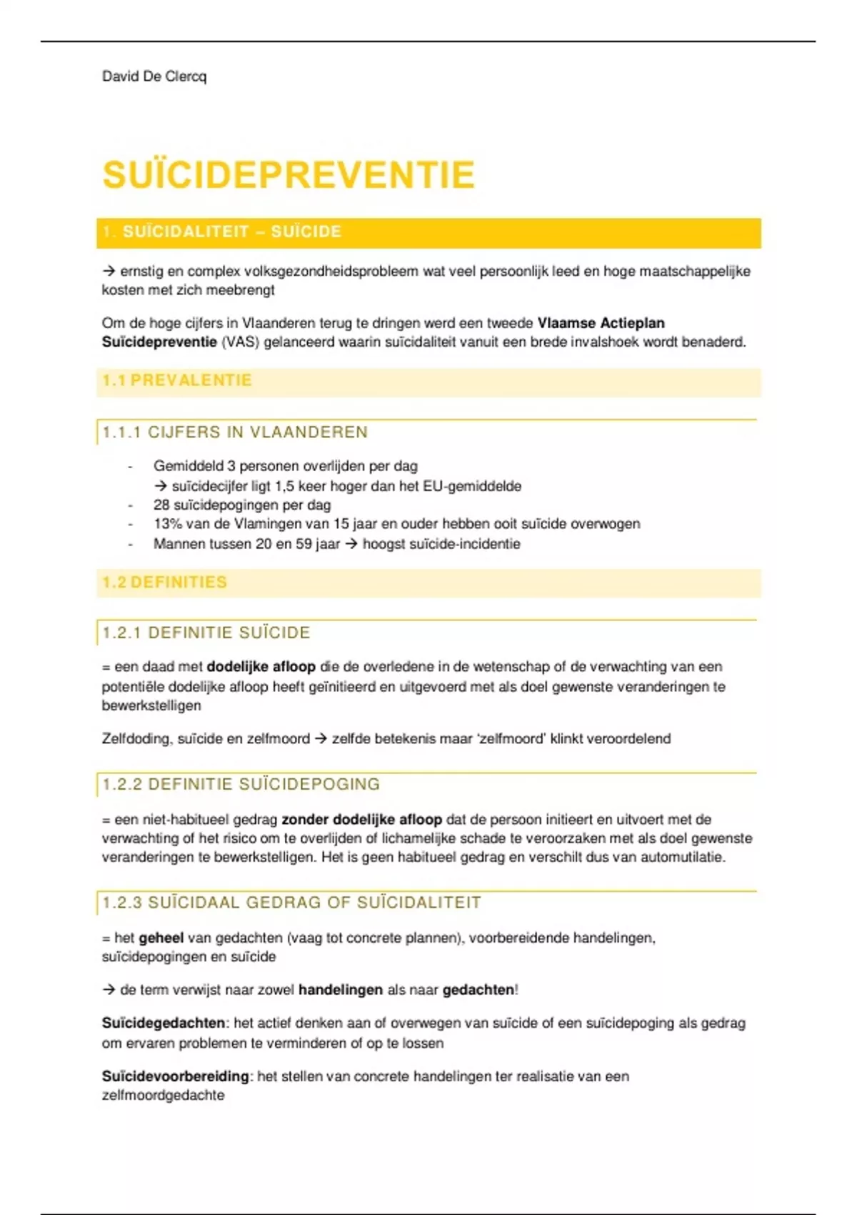 Dit is een samenvatting van de cursus & powerpoints over het deeltje 'SuÏcidepreventie' gegeven door David De Clercq.