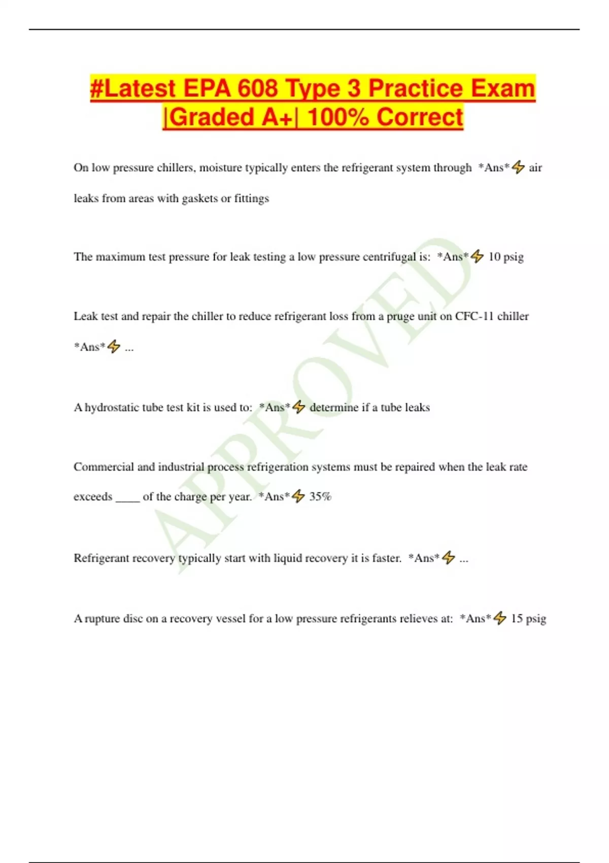 #Latest EPA 608 Type 3 Practice Exam |Graded A+| 100% Correct On low pressure chillers, moisture typically enters the refrigerant system through *Ans* air leaks from areas with gaskets or fittings The maximum test pressure for leak testing a low pressure centrifugal is: *Ans* 10 psig Leak test and repair the chiller to reduce refrigerant loss from a pruge unit on CFC-11 chiller *Ans* ... A hydrostatic tube test kit is used to: *Ans* determine if a tube leaks Commercial and industrial process refrigeration systems must be repaired when the leak rate exceeds ____ of the charge per year. *Ans* 35% Refrigerant recovery typically start with liquid recovery it is faster. *Ans* ... A rupture disc on a recovery vessel for a low pressure refrigerants relieves at: *Ans* 15 psig According to ASHRAE Guideline 3-1996, if the pressure in a system rises from 1 mm Hg to a level above ____ during a standing vacuum test, the system should be checked for leaks. *Ans* 2.5 mm Hg The primary water source for a recovery unit condensing coil is _____. *Ans* local municipal water supply When recharging a refrigeration system with R-11, what vaporpressure is necessary in the shells before changing with liquid? *Ans* 16.9" Hg vacuum After recovering the liquid refrigerant you must: *Ans* recover the vapor refrigerant According to the EPA there is approximately _____ refrigerant vapor left in an average 350 ton R-11 chiller at 0 psig pressure once all the R-11 liquid has been removed. *Ans* 100 pounds Charging refrigerant liquid into a refrigeration system when it is under a 29 inch Hg vacuum can cause the: *Ans* system water to freeze A system does not have to be evacuated all the way to the required level when: *Ans* leaks in the appliance make evacuation to the prescribed level unattainabl