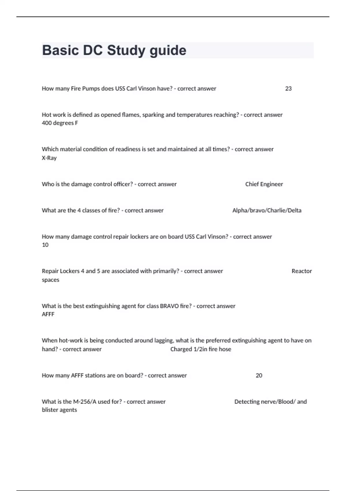 How many Fire Pumps does USS Carl Vinson have? - correct answer 23 Hot work is defined as opened flames, sparking and temperatures reaching? - correct answer 400 degrees F Which material condition of readiness is set and maintained at all times? - correct answer X-Ray Who is the damage control officer? - correct answer Chief Engineer What are the 4 classes of fire? - correct answer Alpha/bravo/Charlie/Delta How many damage control repair lockers are on board USS Carl Vinson? - correct answer 10 Repair Lockers 4 and 5 are associated with primarily? - correct answer Reactor spaces What is the best extinguishing agent for class BRAVO fire? - correct answer AFFF When hot-work is being conducted around lagging, what is the preferred extinguishing agent to have on hand? - correct answer Charged 1/2in fire hose How many AFFF stations are on board? - correct answer 20 What is the M-256/A used for? - correct answer Detecting nerve/Blood/ and blister agents The M-291 kit is used for? - correct answer Decontaminating the skin How many minutes of air will the EEBD provide? - correct answer 10min The training EEBD has a what plastic container? - correct answer Blue Which portable radio does the USS Carl Vinson use? - correct answer AN/ PDQ-1 How many lengths of "elephant trunk" are allowed on a suction side of the RAM Fan? - correct answer 3 What is the power source for the box Fan? - correct answer 115V In the compartment number "" what does the "03" stand for? - correct answer Which deck the compartment is located What word should be stamped on a CCOL in a compartment with more than one entrance? - correct answer Duplicate What is the proper battle dress? - correct answer Long sleeve shirt/ Pants tucked into boots/ Flash gear/boots What is the rated capacity of the box fan? - correct answer 3200cfm What is the power source for a RAM fan? - correct answer Firemain What does MPE stand for? - correct answer Maximum Permissible Exposer What is the rated capacity of the RAM fan? - correct answer 2000cfm What are the three pressure switches used for the HALON system? - correct answer Pre-discharge/Ventilation securing/ discharge alarm Which Nuclear blast does the fireball touch the earth surface? - correct answer Surface blast Phosgene is what kind of chemical agent? - correct answer Choking What is your first line of defense for yourself in a chemical attack? - correct answer Gas Mask What does MOPP stand for? - correct answer Mission Oriented Protected Posture How many decontamination stations does the USS Carl vision have? - correct answer 4