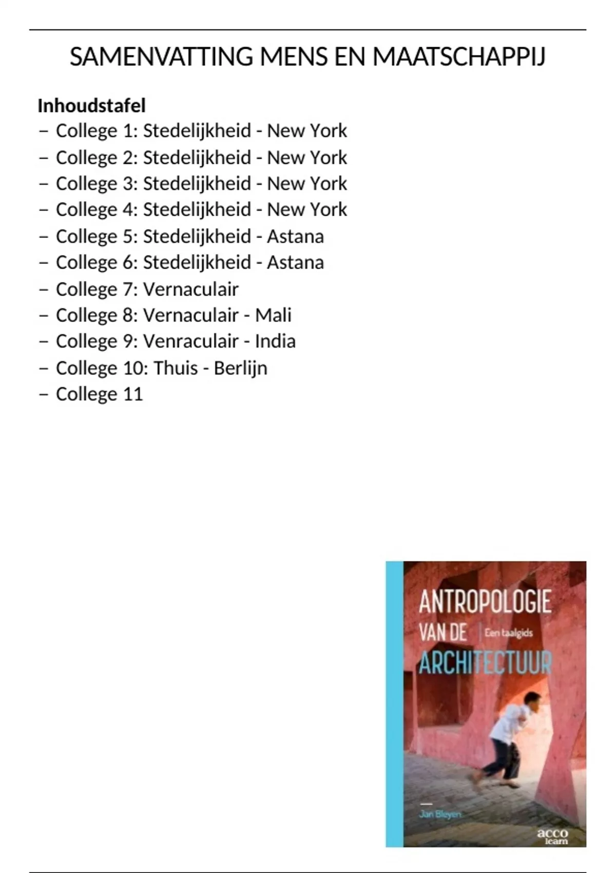 Dit is een samenvatting van het vak Mens en Maatschappij in de opleiding Architectuur. Er werd een overzicht gemaakt van de lessen en casestudy's en de concepten staan per les opgelijst. Op het einde van het document vind u nog tips over het examen van de prof zelf en een aantal examenvragen.