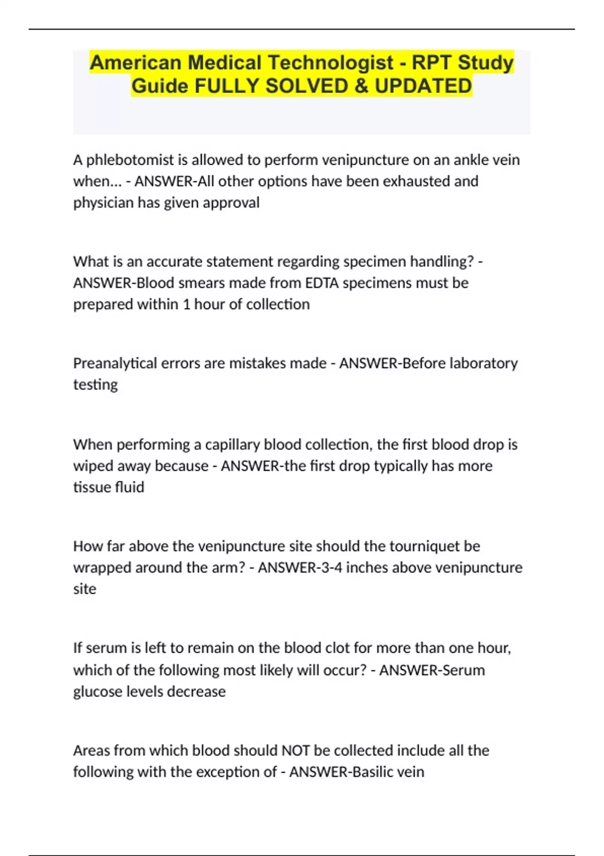 A phlebotomist is allowed to perform venipuncture on an ankle vein when... - ANSWER-All other options have been exhausted and physician has given approval What is an accurate statement regarding specimen handling? - ANSWER-Blood smears made from EDTA specimens must be prepared within 1 hour of collection Preanalytical errors are mistakes made - ANSWER-Before laboratory testing When performing a capillary blood collection, the first blood drop is wiped away because - ANSWER-the first drop typically has more tissue fluid How far above the venipuncture site should the tourniquet be wrapped around the arm? - ANSWER-3-4 inches above venipuncture site If serum is left to remain on the blood clot for more than one hour, which of the following most likely will occur? - ANSWER-Serum glucose levels decrease Areas from which blood should NOT be collected include all the following with the exception of - ANSWER-Basilic vein Hemoconcentration of a specimen can be avoided by - ANSWER-Removing the tourniquet within one minute Petechiae are tiny, non-raised red spots on a patient's skin when the tourniquet is applied. This indicates, that - ANSWER-The venipuncture site may bleed excessively If additive contamination occurred from an EDTA evacuated tube, what test would potentially be affected? - ANSWER-Potassium level is affected if there is contamination of the EDTA additive. The phlebotomist would collect a blood sample in a tube containing the anticoagulant sodium citrate (which inhibits glycolysis) for which type of laboratory test? - ANSWER-Erythrocyte Sedimentation Rate (ESR) The color-coded tube that is most frequently associated with hematological tests is - ANSWER-Lavender top When blood collected in a syringe must be placed in evacuated tubes it is best if - ANSWER-a blood transfer device is attached to the syringe. f blood begins to flow and then stops when an evacuated tube is pushed into the needle the most likely cause is the - ANSWER-bevel of the needle resting against the vein wall. Following venipuncture, which of the following should be applied to the venipuncture site? - ANSWER-A clean, sterile gauze pad A serum or plasma specimen from a patient with severe lipemia would visibly appear - ANSWER-Milky Which of the following may cause hematoma formation? - ANSWER-Having patient bend elbow to apply pressure What information would NOT be indicated on the label of a blood bank specimen? - ANSWER-NPO status of the patient and time of last meal The phlebotomist places the blood specimen in circles on special filter paper, for what test? - ANSWER-PKU/Newborn Screening Test An individual comes in for an autologous donation, what is this person coming to do? - ANSWER-Donating their own blood for their own use A postprandial specimen is collected - ANSWER-directly after a meal is consumed. A blood sample is needed from a dialysis patient. Which of the following is an acceptable procedure? - ANSWER-Draw from a hand vein When is a phlebotomist allowed to use ankle veins to draw blood? - ANSWER-With a physician's order What is the correct procedure to stop the bleeding at a venipuncture site? - ANSWER-Place a gauze pad over the site and hold pressure for 5 to 15 minutes What color evacuated tube would be commonly used for coagulation testing? - ANSWER-Light blue The phlebotomist has to prepare a blood smear for a leukocyte alkaline phosphatase (LAP). What is the correct procedure? - ANSWER-Perform the skin puncture, wipe away the first drop of blood and then touch the slide to the next drop of blood You have to draw a 7 year old child for some blood work, what would be the best approach you should use when it is a child getting blood drawn? - ANSWER-Explain what you are going to do in simple terms and ask the child for his or her cooperation. Partial penetration of the upper wall of a vein may - ANSWER-allow blood to leak into subcutaneous tissue by way of the needle bevel If the plunger on the syringe is pulled back too fast... - ANSWER-The specimen may be hemolyzed The primary reason for using a syringe transfer device is to - ANSWER-safely transfer blood from a syringe into ETS tubes. When palpating, a vein having which one of the following characteristics would be most appropriate to select for venipuncture? - ANSWER-Bouncy Which of the following is of primary importance in preventing rolling veins during venipuncture? - ANSWER-Anchoring the vein while inserting the needle How long should a tourniquet be placed around a patient's arm? - ANSWER-No more than one minute The liquid portion of an anticoagulated blood specimen is called - ANSWER-Plasma A basal-state specimen, used to establish reference ranges for inpatients, is best collected - ANSWER-early in the morning, after fasting for 12 hours. When a patient states that he or she has a needle phobia, the phlebotomist should - ANSWER-have the patient lie down during the procedure. The heel is the recommended site for collection of capillary puncture specimens on infants and the phlebotomist is going to stick in the posterior curvature of the heel. Is this correct? - ANSWER-No the medial plantar surface of the heel is the best site to prevent possible bone damage If additive contamination occurred from an EDTA evacuated tube, what test would potentially be affected? - ANSWER-Potassium level You have properly prepared the antecubital venipuncture site, you have the corrrect collection device and enter the vein at a 20 degree angle. Is this the proper angle of insertion? - ANSWER-No, 30 degrees is the correct angle for the needle to be inserted into the skin Which of the following situations would most likely trigger hematoma formation? - ANSWER-Removing the needle while the tourniquet is still on the arm. When a patient develops syncope during a venipuncture, the phlebotomist should first: - ANSWER-Remove tourniquet and needle and call for help What instrument may be used when trying to visualize the veins during venipuncture? - ANSWER-Venoscope