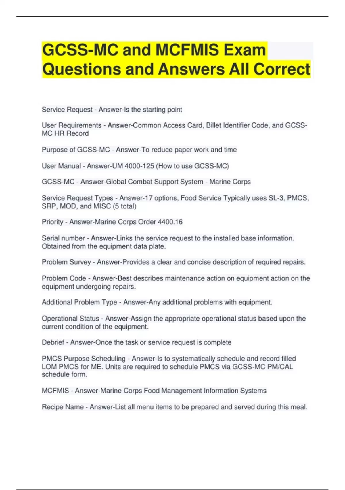 GCSS-MC and MCFMIS Exam Questions and Answers All Correct Service Request - Answer-Is the starting point User Requirements - Answer-Common Access Card, Billet Identifier Code, and GCSS- MC HR Record Purpose of GCSS-MC - Answer-To reduce paper work and time User Manual - Answer-UM 4000-125 (How to use GCSS-MC) GCSS-MC - Answer-Global Combat Support System - Marine Corps Service Request Types - Answer-17 options, Food Service Typically uses SL-3, PMCS, SRP, MOD, and MISC (5 total) Priority - Answer-Marine Corps Order 4400.16 Serial number - Answer-Links the service request to the installed base information. Obtained from the equipment data plate. Problem Survey - Answer-Provides a clear and concise description of required repairs. Problem Code - Answer-Best describes maintenance action on equipment action on the equipment undergoing repairs. Additional Problem Type - Answer-Any additional problems with equipment. Operational Status - Answer-Assign the appropriate operational status based upon the current condition of the equipment. Debrief - Answer-Once the task or service request is complete PMCS Purpose Scheduling - Answer-Is to systematically schedule and record filled LOM PMCS for ME. Units are required to schedule PMCS via GCSS-MC PM/CAL schedule form. MCFMIS - Answer-Marine Corps Food Management Information Systems Recipe Name - Answer-List all menu items to be prepared and served during this meal. Master Reference - Answer-Generated by the subsistence office. Portion Size - Answer-This should correspond to the portion size on the recipe card. Forecast - Answer-Estimated number of portions to be served for each meal. Served - Answer-Amount of portions served throughout the meal. Leftover - Answer-All unused portions remained from hot or cold storage Temp - Answer-Enter initial temp of cooked itemsi in accordance with Armed Forces Recipe Card Cook's Quantity - Answer-Use this section to issue any instructions not covered in other Columns. EX: Use Left overs in red ink. Production Worksheet - Answer-Every meal required to make. Pull sheet - Answer-Are subsistence issue throughout the day. (Pull) Nutrient Analysis Report - Answer-Based on 2000 calories diet. MC Food Service and Subsistence Program - Answer-Marine Corps Order 10110.14_ MCFMIS Revision - Answer-MCFMIS SOP, Revision 7