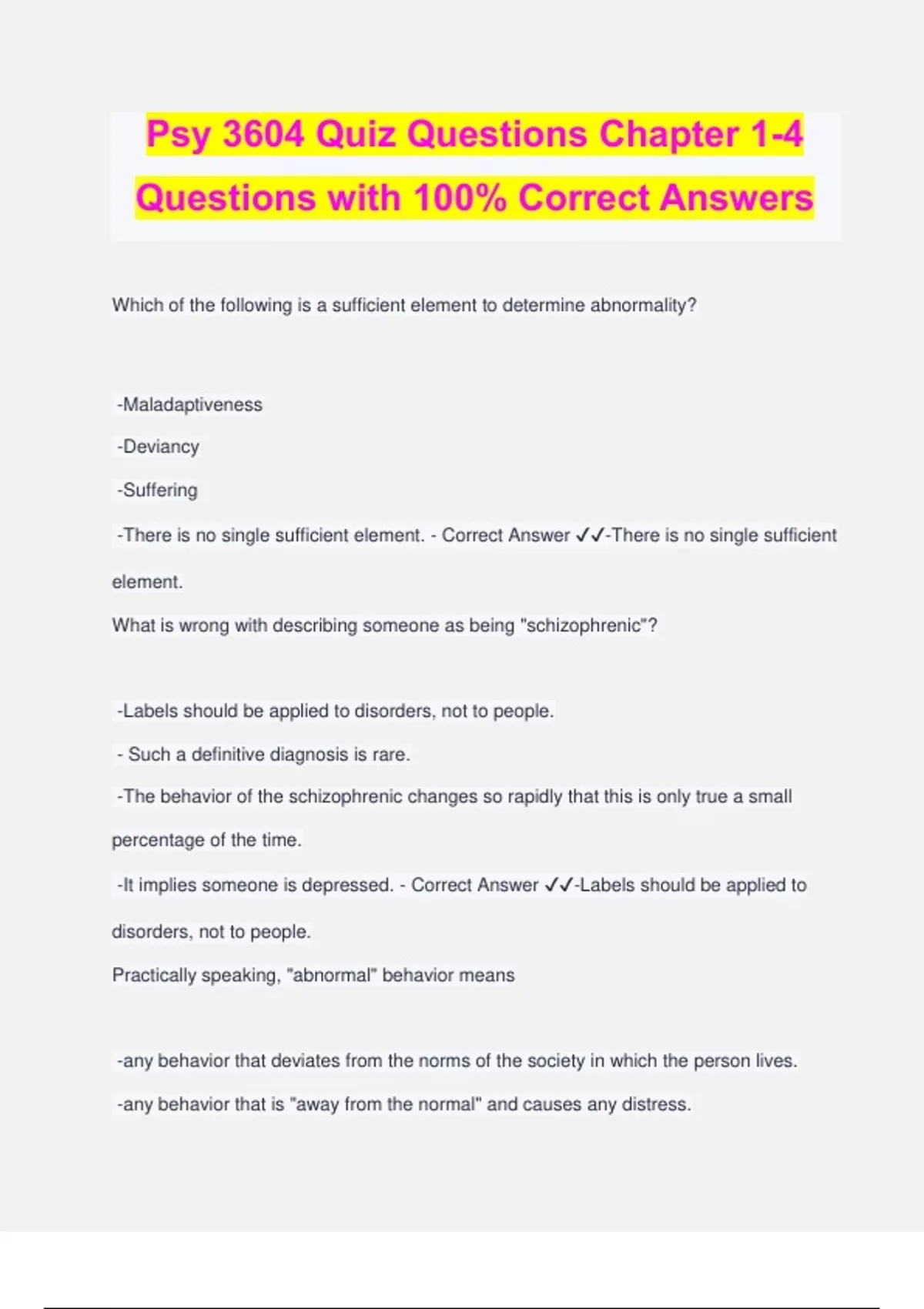 Psy 3604 Quiz Questions Chapter 1-4 Questions with 100% Correct Answers Which of the following is a sufficient element to determine abnormality? -Maladaptiveness -Deviancy -Suffering -There is no single sufficient element. - Correct Answer ️️ -There is no single sufficient element. What is wrong with describing someone as being "schizophrenic"? -Labels should be applied to disorders, not to people. - Such a definitive diagnosis is rare. -The behavior of the schizophrenic changes so rapidly that this is only true a small percentage of the time. -It implies someone is depressed. - Correct Answer ️️ -Labels should be applied to disorders, not to people. Practically speaking, "abnormal" behavior means -any behavior that deviates from the norms of the society in which the person lives. -any behavior that is "away from the normal" and causes any distress. -any behavior that causes us to consider our values. -any behavior that causes the person distress. - Correct Answer ️️ -any behavior that deviates from the norms of the society in which the person lives Which of the following is an example of point prevalence? -Seventy people in one graduating class were diagnosed with anorexia at some time during the past four years. -15% of women will suffer from an anxiety disorder before the age of 30. -1% of the population is currently experiencing depressive symptoms. -Forty people had panic attacks in the last year. - Correct Answer ️️ -1% of the population is currently experiencing depressive symptoms. What does the term etiology mean relative to psychological disorders? -It concerns the treatments for psychological disorders. -It concerns how family fits in with psychological disorders. -It concerns the causes of psychological disorders. -It concerns how culture fits in with psychological disorders. - Correct Answer ️️ -It concerns the causes of psychological disorders. One strength of case studies is ________ -they can generate new ideas to explore. -they are usually highly accurate. -they can help prove causal relationships between variables. -they do not involve bias. - Correct Answer ️️ -they can generate new ideas to explore. A researcher interested in the health problems of people with schizophrenia interviews only those people diagnosed with the disorder who are in an inpatient facility. The most glaring weakness in this study is ________ -having an inappropriate control group. -nonrepresentative sampling. -the absence of correlational statistics. -the failure to use DSM-5 criteria for health problems. - Correct Answer ️️ - nonrepresentative sampling. To determine whether certain characteristics are true of people in general, and not just of people with mental disorders, it is important to use -a representative sample of individuals with the disorder. - an experimental design. - a control group. -a criterion group. - Correct Answer ️️ -a control group. Which of the following may be safely inferred when a significant negative correlation is found between variables x and y? -as x increases, y decreases -as x increases, y increases - y causes x -x causes y - Correct Answer ️️ -as x increases, y de