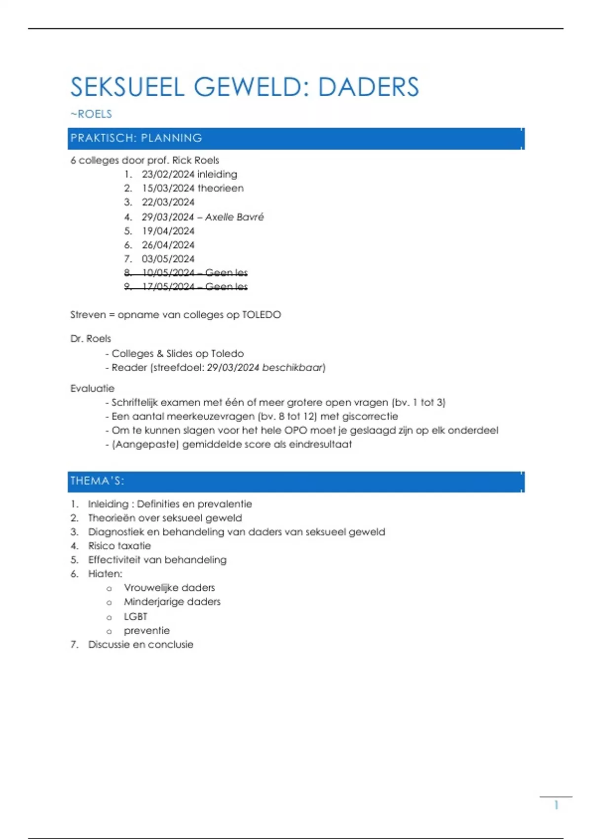 Seksueel geweld: slachtoffers en daders (B-KUL-E00M6A) is een opleidingsonderdeel in Master Seksuologie (2de fase) aan de KU Leuven. Dit is een complete ( en zeeeer goede ;) ) samenvatting van beide delen (slachtoffers & daders) inclusief dia's en notities.